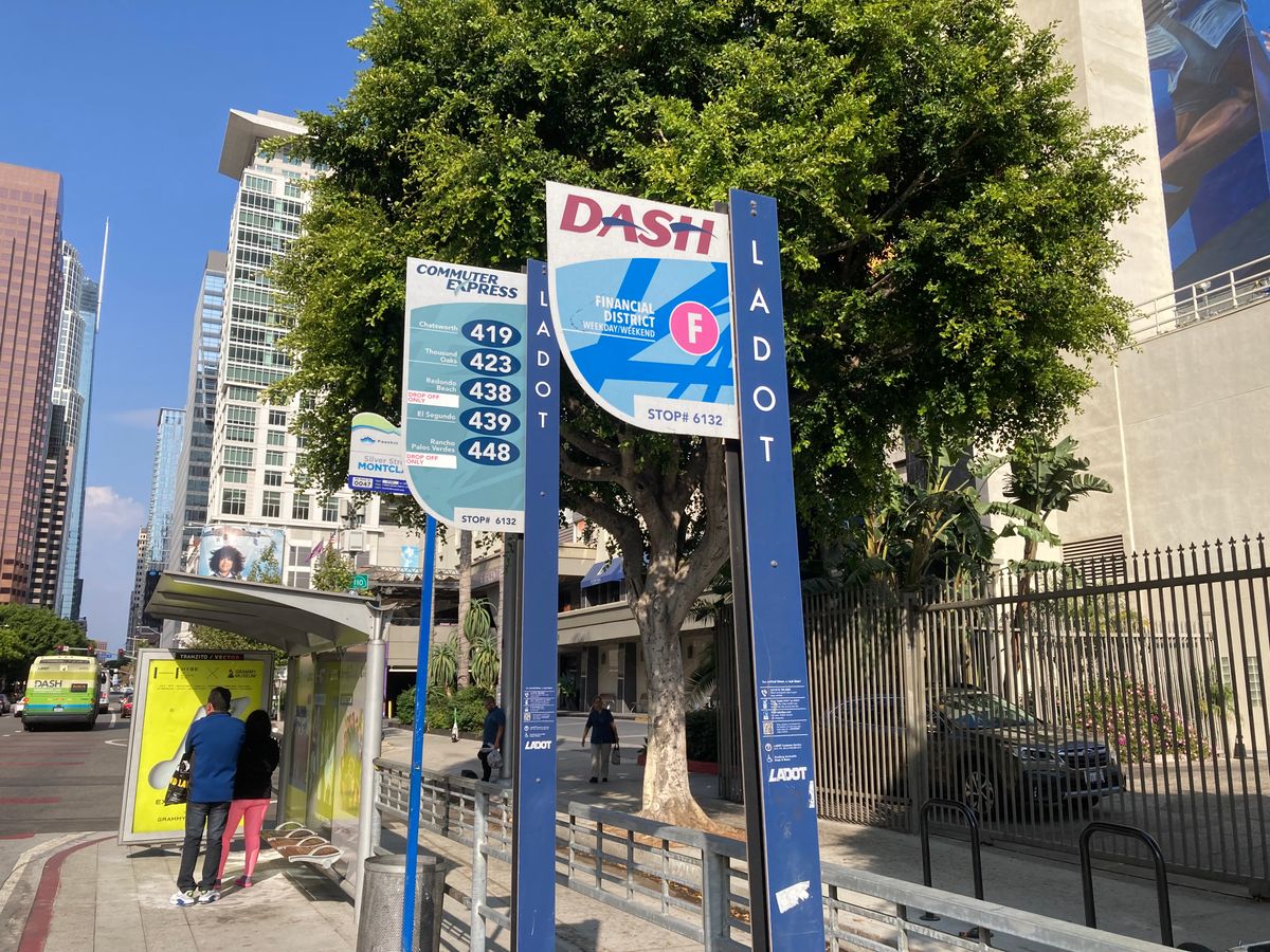 私たちはホテル前の44番バス停からのスタートでしたが、過去の皆様からの体験談のとおり、バス停がどこなの?と多くの方は迷われると思います。ホテルの方に事前に確認して私たちも問題はなかったのですが44番との表記はなく(写真)路線バスのバス停を使っていました。また、他のバス停は、印すら見付けることは難しい場所もあったので乗車するときは、バスがくるのを注意深く見ておくことと、下車するときは、音声案内でガイドされるので、よく聞いて通り過ぎないように注意が必要です。また、私たちは猛暑の日本から移動し、9月21日に利用したのですが、ロサンゼルスは気温が低く(10度後半?)2階席では寒く、最後は1階で周遊する結果になり残念でした(遥かに2階席の方が特等席です)ロサンゼルスも熱いのだろうと思い込んでいた私たちにとっては大きな誤算でパーカーを現地で購入し、寒さに対応しました。