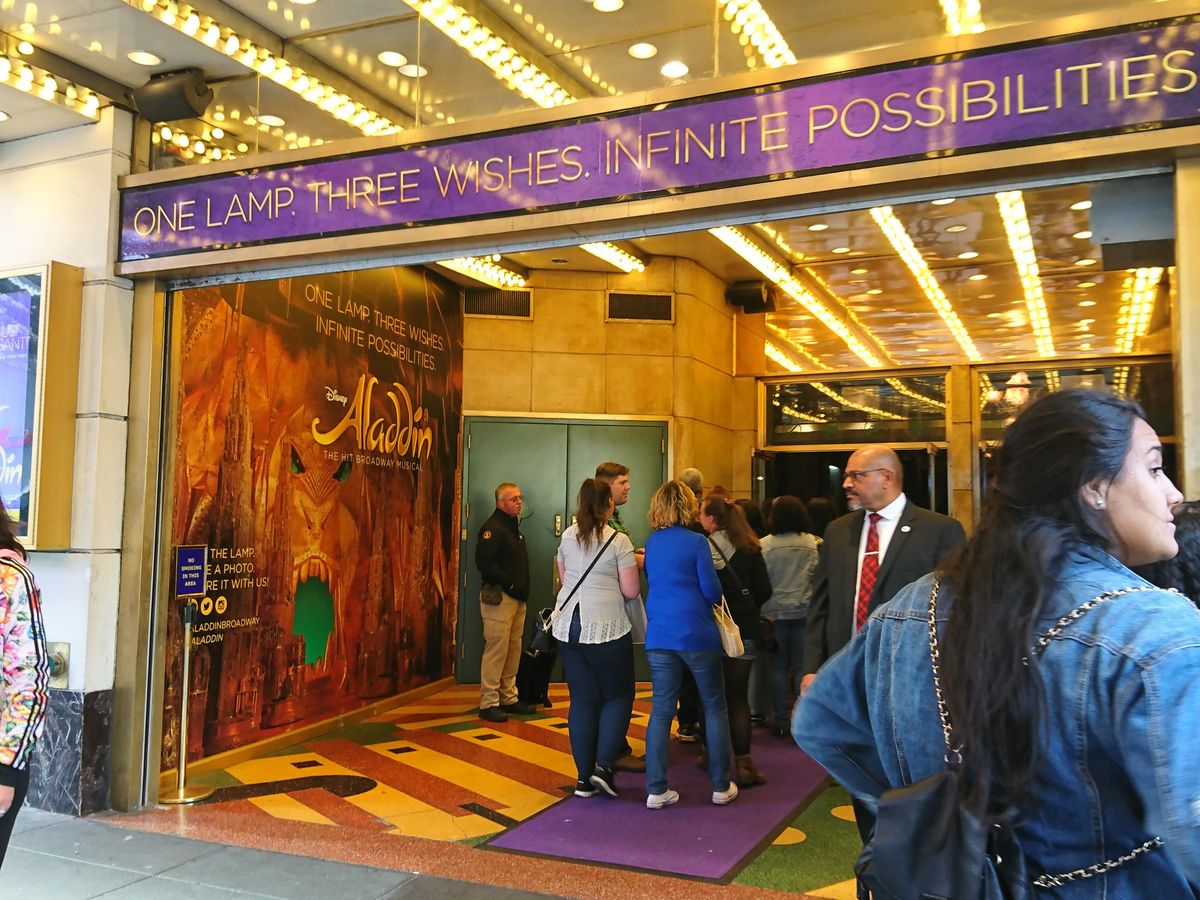 N.Yのミュージカルは3回目でしたが「アラジン」は大人気ということでチケットの手配をお願いしました。当日券を買おうとした方はもう予約がいっぱいですと断られていたので、あらかじめお願いしていて良かったです。席は中央で見やすくいう事なかったのですが、空調の真下で上着を持って行ったのですがそれでも寒くてブルブル震えて見ました。近くの日本人の観客の方もずっと寒い寒いと言っていました。これが一番きつくて残念でした。
