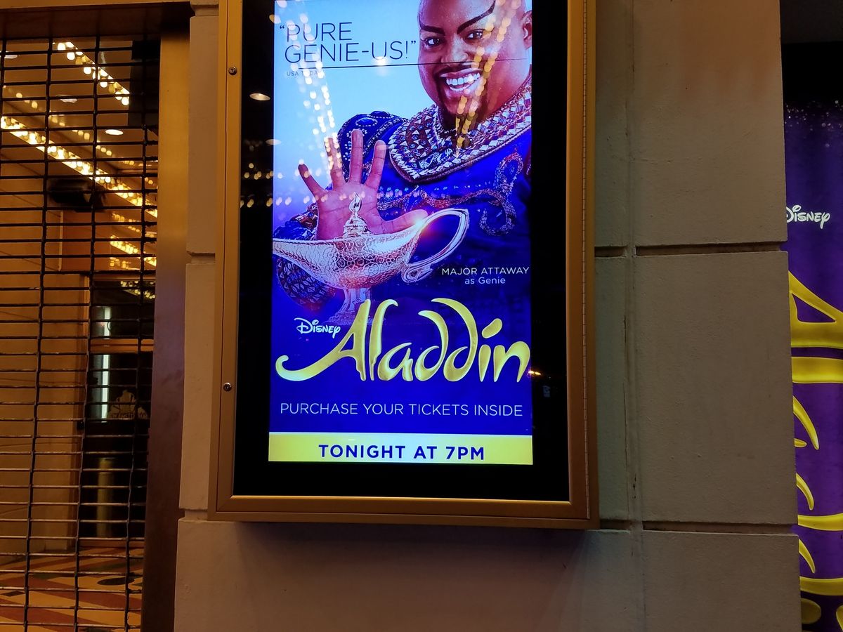 初めて本場のミュージカルを見ましたが、すごい迫力でした。アラジンはディズニー映画ですので英語がわからなくても十分楽しめました。誰もが満足するのではと思います。