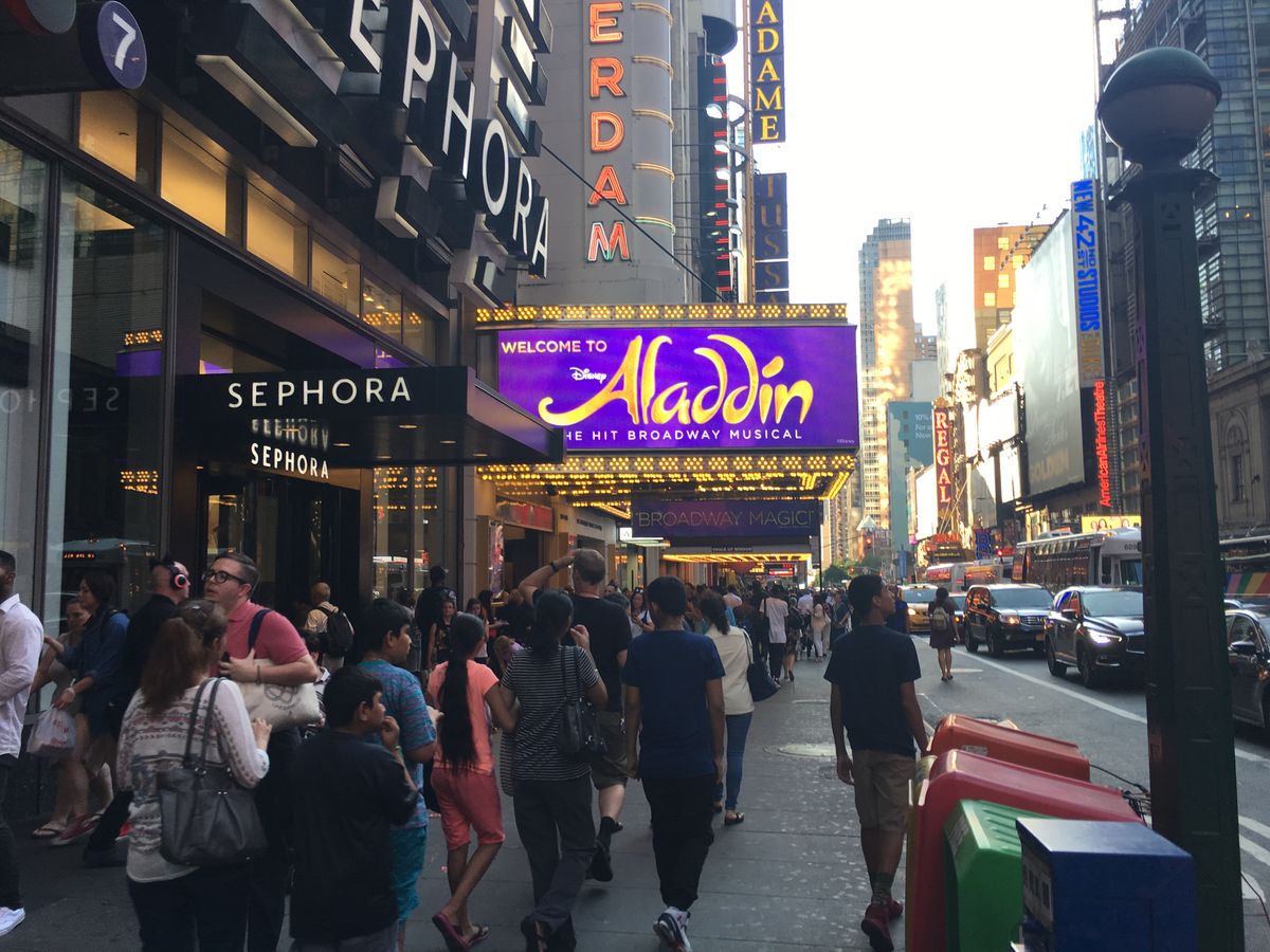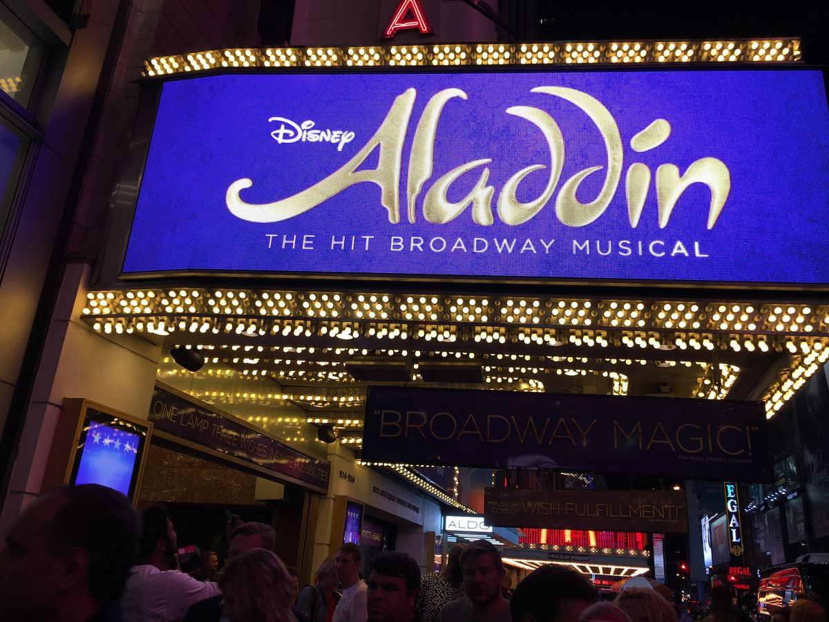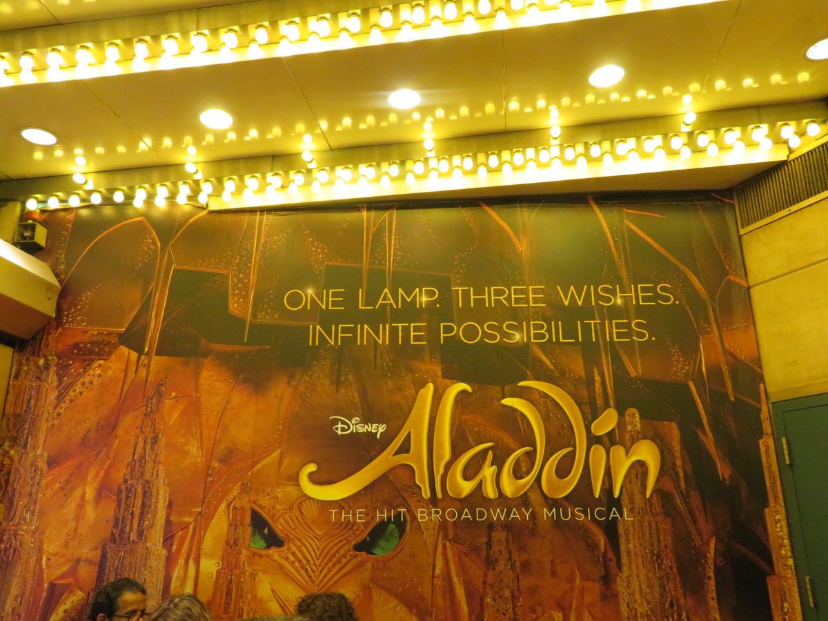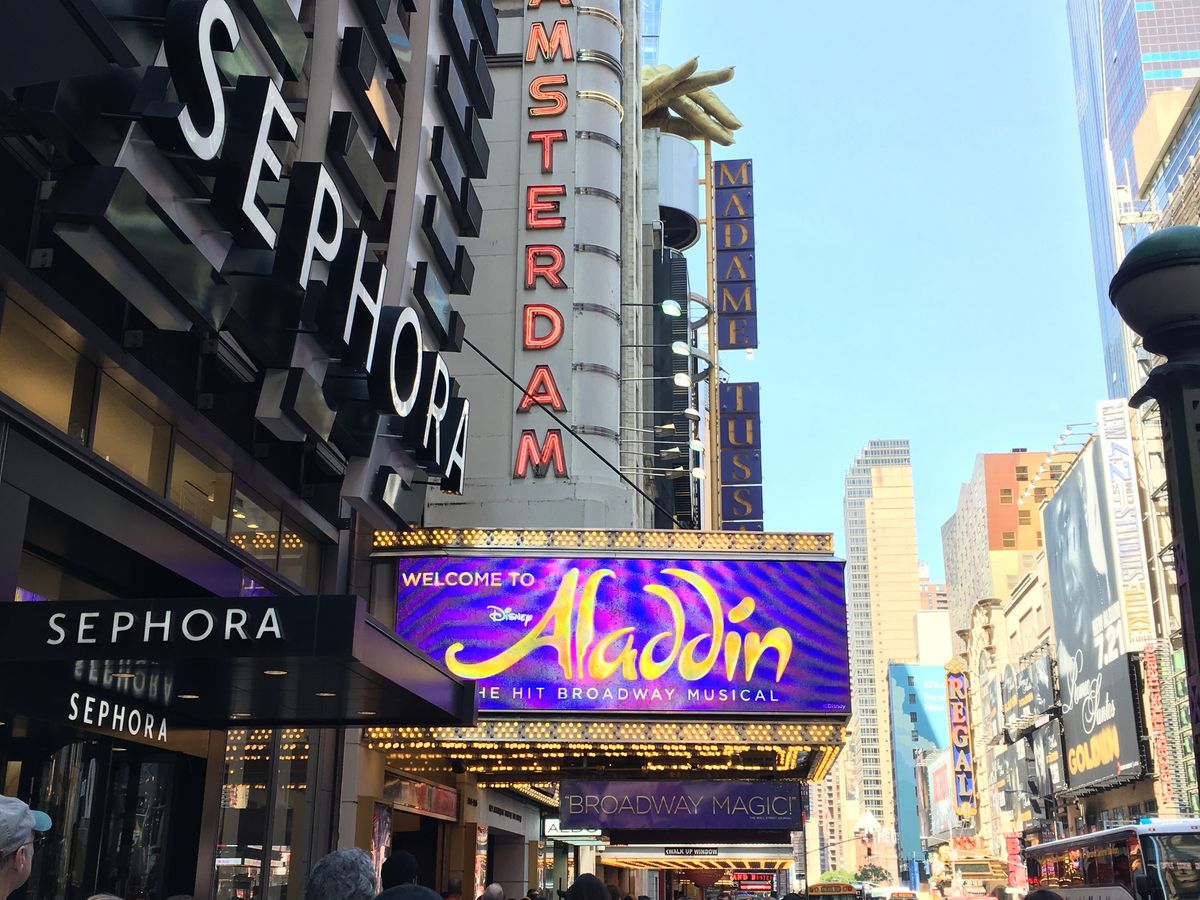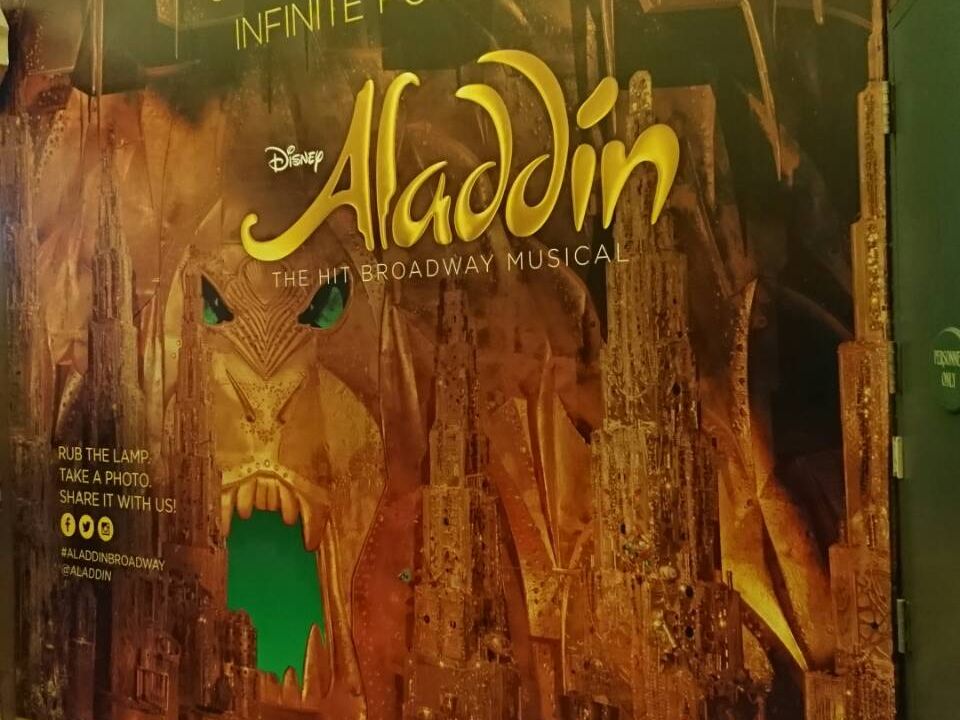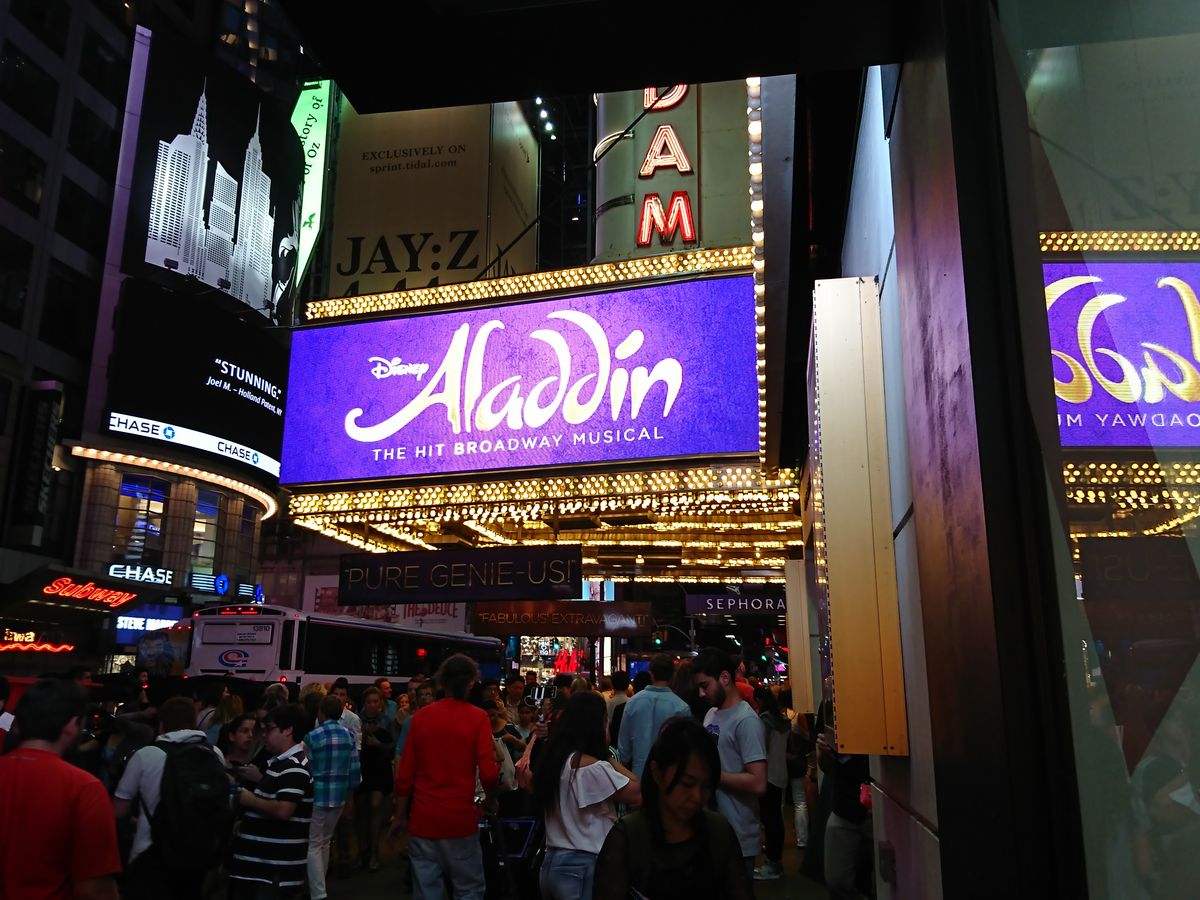ブロードウェイでアラジンを見るのが楽しみで、当日迎えました‼ブロードウェイの中は素敵な作りで入るとテンションが上がって時差ボケも飛んでいきました。生演奏のバックミュージカルに加え、出演者の生歌が響いて最高でした(*^^*)ジーニーが本当にファニーで良かったです‼