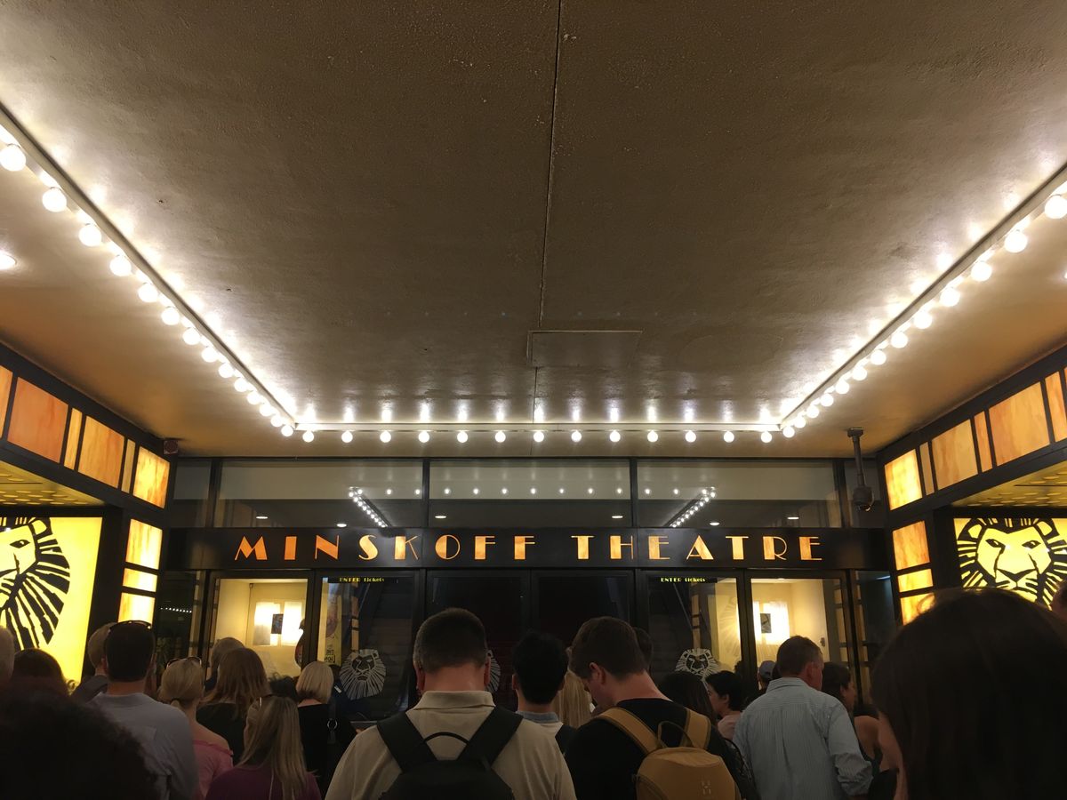 初めてのブロードウェイ・ミュージカル見物なので不安でしたが、チケットはバウチャーを窓口に出すだけでスムーズに受け取れました。席が3階だったのでどの程度舞台が見えるのか心配もあったのですか十分に楽しめました。