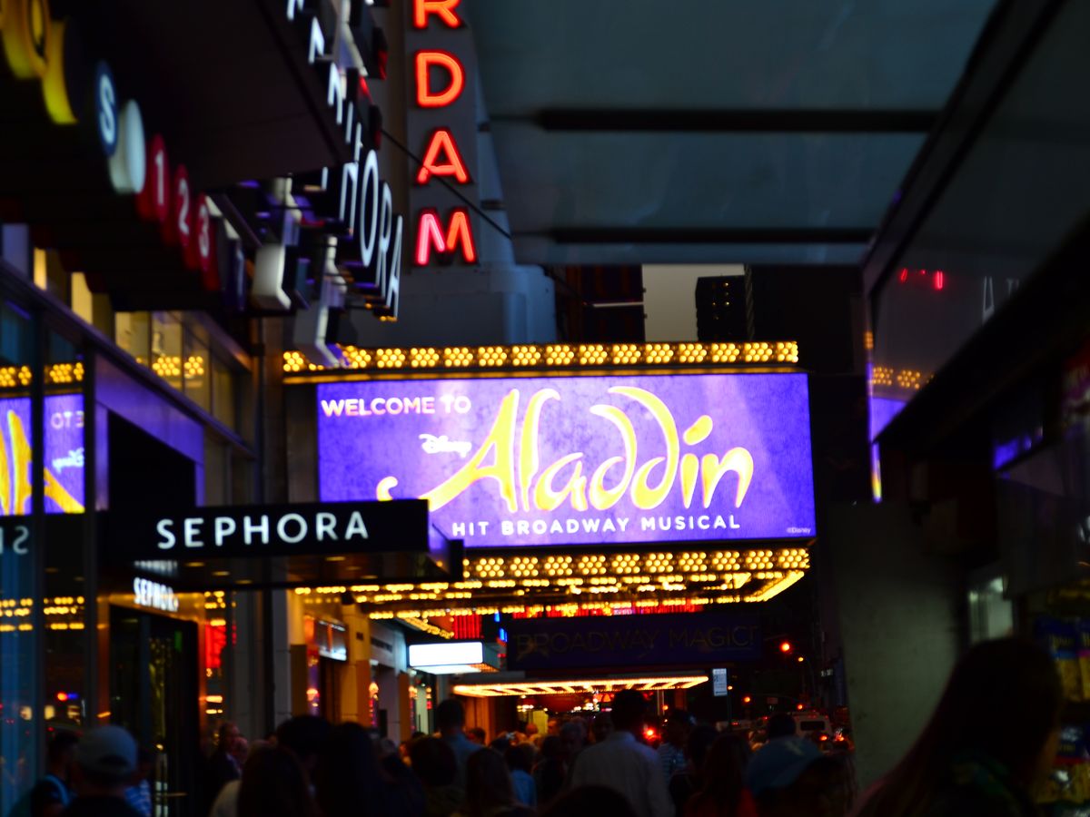日本でも話題になっているアラジン。日本のチケットはなかなか取れないようですが、ブロードウェイは予約も直前でしたが空きがありました。皆さんの体験談を読むとオーケストラがいいということなので私もオーケストラで予約をいたしました。結果大正解でした。少し高くても前側の席で見れる体験には替えられません。NYでも人気のようで満席、チケット交換も大変スムーズにいきますが(さすがベルトラ!)、混み合ってます。会場はとても狭い!言葉で書いても伝わらないほど席と席の間が狭いです笑。狭いというか間なんてないくらい。まあそれは評価には何も関係しないのですが。