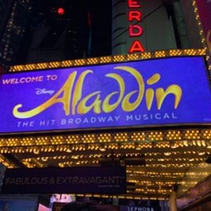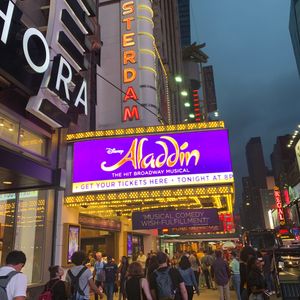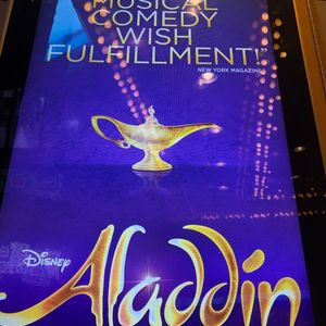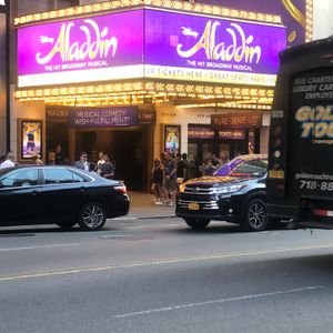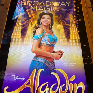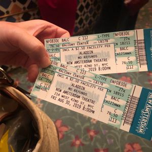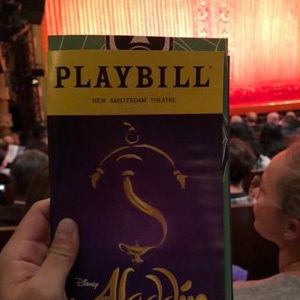 場所はタイムズスクエアの近くで、Aladdinのネオンも目立つのでわかりやすくて、迷うことはなかった。早めに着いたのでバウチャーをチケットに交換して、近くのAPPLEBEE'Sというレストランで食事をしました。おいしくてオススメです。今回は一番安いバルコニー席にしましたが、会場はどの席からでも鑑賞しやすいようになっているので安いバルコニー席で十分でした。日本語のAudioTransの貸し出しがありましたが、有料(1ドル)だったので借りなかった。日本で何回かAladdinの映画を観てたのでストーリーは理解できたので良かった。途中15分位のインターバル(休憩)がありますが、トイレは混みますので開演前にトイレを済ませておくことをオススメします。