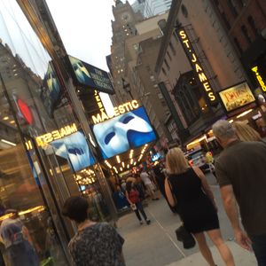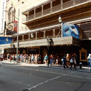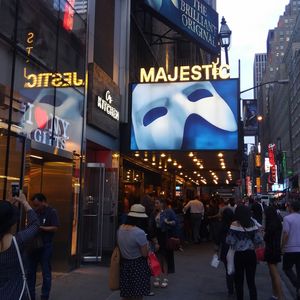 タイムズスクエアーから歩いて数分。すぐにファントムの青白い仮面の看板を携えたマジェスティックシアターが見つけられます。少し視線を下げると、開場を心待ちにしている人々の列が目に飛び込んできました。