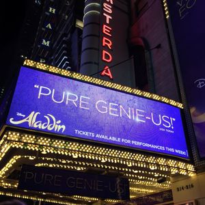 初めてのニューヨーク旅行だったので、ぜひ本場ブロードウェイのミュージカルを見たいと思っておりました。バルコニー席の後ろのほうでちょっと遠いなーとおもったのですが、ステージが始まると、歌もダンスもさすが、そしてアラジンの世界をこの限られた舞台で表現してしまう凄さ! 本場のエンターテインメントの素晴らしさを充分味わい楽しんだ一夜でした。