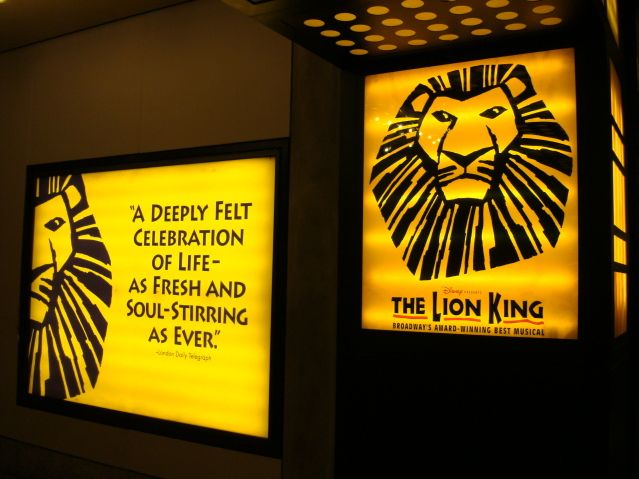 娘と行きました。東京でもライオンキングを前に見ましたが、さすがブロードウエィ迫力がありました。休憩時間では劇場のロビーから賑やかなタイムズスクエアの全貌がガラス越しに見えて良かったですよ。