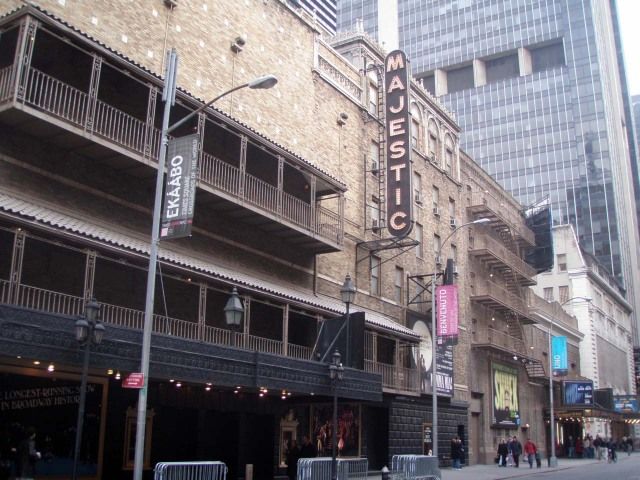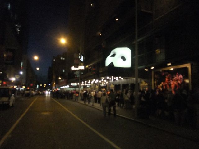 30分前にマジェステック劇場へと歩いていると、あの仮面が見えてきました。長蛇の列!(150m位) チケットを交換するのに困った…。入り口まで行って見ると入場の列でした。入場するのに一番後ろまで行かなくてはと思っていると整理している、おじさんが間に入れてくれてあっというまに入場できてしまいました。前にいた人には後ろに回れと言っていたのに不思議でした。映画を見ていたので英語でも楽しくみることができました。舞台装置、オーケストラ、衣装そして響きわたる声! 眠ってしまうかな~と思っていましたが英語のできない私でも楽しくてあっと言う間に終わってしまいました。衣装を楽しむだけでも十分と思います。タクシーも直ぐにつかまりました。(運が良かったようです。) 余談ですが国連の日が近づいていて、おまわりさんはほとんでいませんでした。馬に乗ったおまわりさんを見たかったのですが残念でした。それとクーラーが効きすぎているのでコートとスカーフがあればと思いました。