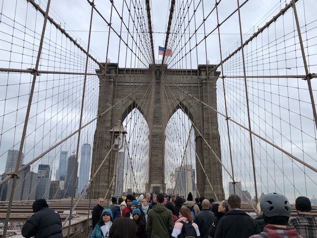 今回のツアー私たち2人だけでした。お店は並ぶことも無くスムーズに席まで案内してもらえました。予約なしで行くと席に着くまで1時間は掛かるとのこと。外はカリカリ、中はジューシー家では焼けないなと感激。食べ残ったお肉、パン、ほうれん草のソテーはお持ち帰りに包んでもらえました。夜ホテルでワインのおつまみになりました。食後ガイドさんにウィリアムズバーグをぶらぶら歩き、桟橋まで案内してもらいました。そこからわたしたし2人はフェリーでブルックリンブリッジパークへ移動し、橋を歩いて渡りました。橋に上がる道筋は解りにくかったですがガイドさんに教えて頂いたように辿りました。