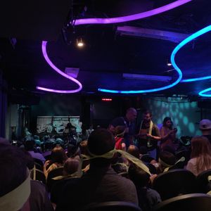 入場すると各席に雨ガッパが置いてあり しばらくすると スタッフが 黄色の紙テープを切って頭に巻けと配って回ります。みんな同じ格好になって 何か始まる期待感が増していきます。