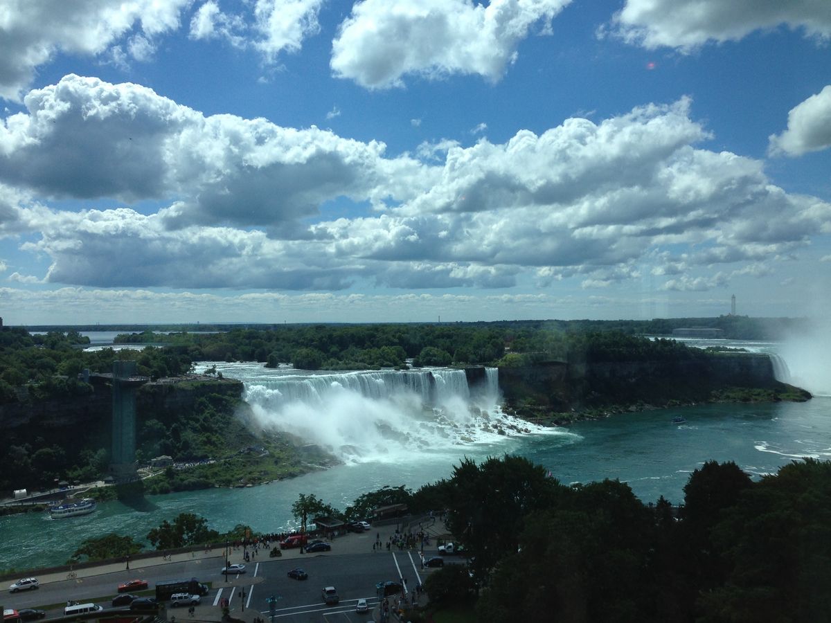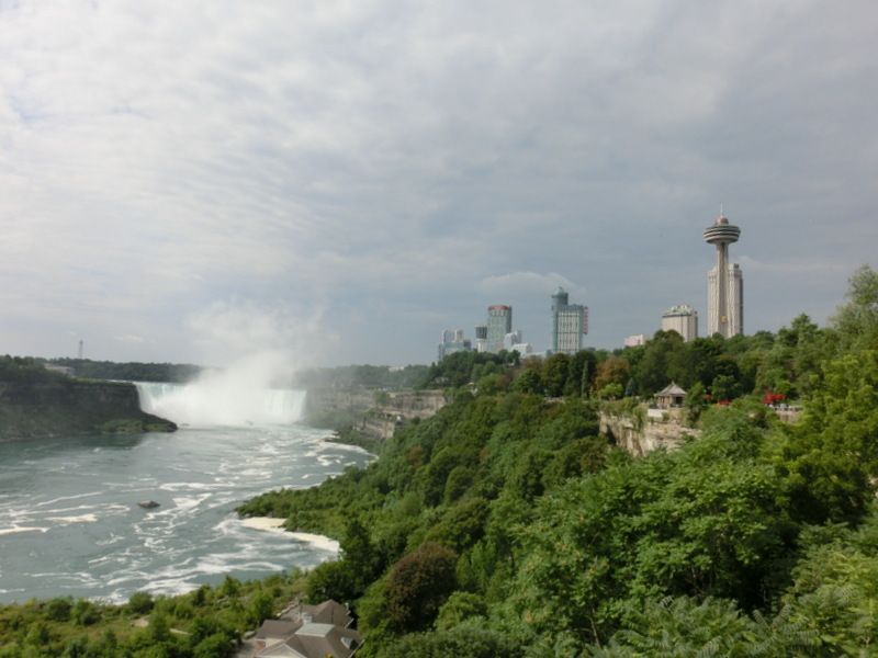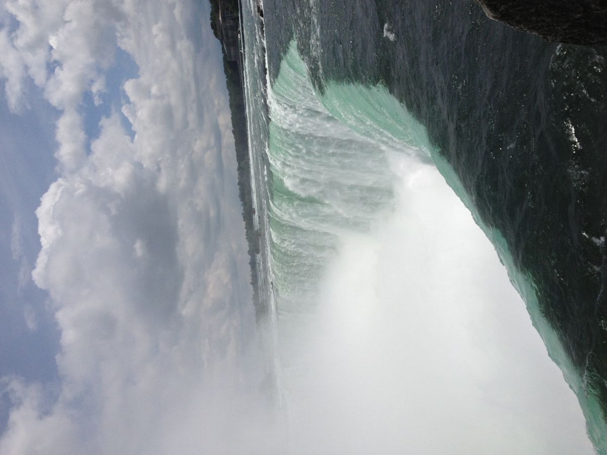 遠くから眺めれば、滝の勢いで滝壷の水が巻き上げられて、雲にまで到達している姿に驚嘆できる。ナイアガラフォールズの街中は、舞い上がった滝の水が風向きによって降り注ぎ、小雨の中にいるみたいだ。