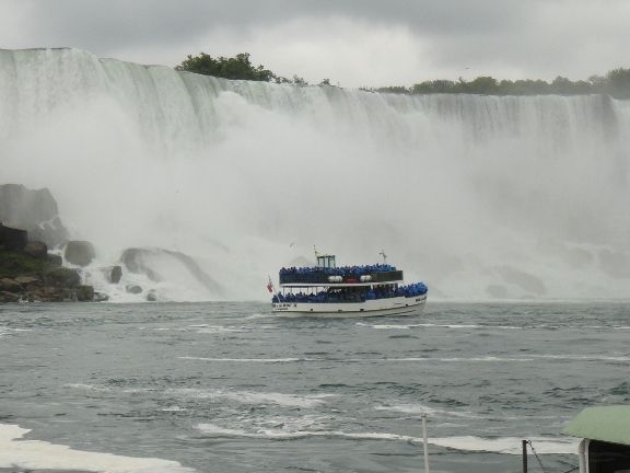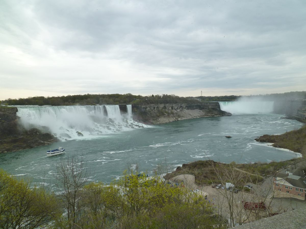 テレビではよく見るナイアガラの滝。子どもの時よりいつか行ってみたいと思っていました。それが今回実現!◆早朝、ケネディー空港に集合。飛行機、バスを利用してたどり着いたのは森林繁る大自然の中! ではなく、美しく整備された観光地でした。滝の周りは巨大ホテルがびっしり。滝で食べている町です◆まずはホテルの最上階で滝を眺めつつバイキング形式の昼食。相席は姉弟の若い2人。旅は道連れ。しばしアメリカでの体験談の交流◆その後、ガイドさんの案内で観光船乗り場へ。30分ほど列をなし、簡単なレインコートをもらって乗船。船上はさながら護送船の如き混雑。バス移動の際、ガイドさんより聞いていた、滝がよく見える場所をゲット。船は滝壺に向けてゆっくりと移動。水しぶきを浴びながら落水の轟きの中、シャッターをパチパチ。船上は歓声の渦。ここがこのツアー醍醐味。天気もよく水しぶきがまた心地良く実に爽快でした◆20分ほどのクルーズを終えて下船。時間に余裕があるとのことで、車で5分程の滝の落ち口へ移動。その後土産物屋案内、各自付近散策。ナイアガラを後にして、バスでバッファロー空港へ◆ここで予期せぬ事態に。ニューヨークへ戻る飛行機の到着が遅れているとの情報。ましてやいつ来るともわからないとのこと。とりあえずは腹ごしらえと、貰ったミールクーポンを持ってマクドナルドへ。既に片付けの準備中。不機嫌な中セットを注文。見れば他の店も閉店の気配。ふと、昼食で相席した姉弟のことが気になる。探してみると、待合のイスで仮眠の準備。「店が閉まるよ。食べるものだけ調達を・・・」と告げると、急いで行き、食べ物を手に戻ってきて「ありがとうございました。閉まるところでした。」◆結局、飛行機は数時間の遅れ。ケネディ空港に深夜到着。最近は安全になったとは聞いたが、娘と2人での深夜の地下鉄は避け、タクシー乗り場へ。定額の60ドル支払いホテルに戻れたのは夜中2時前。身の危険のないトラブルは思い出の一つと諦め、印象深い一日を終えました◆時間も費用もそれなりですが、行って良かった。そして、もし問われれば、「せっかくニューヨークに行くのなら、ナイアガラも見ておけば。」というのが私の感想です。では、グッドラック◆因みに、NHK「坂の上の雲」で高橋是清と秋山真之がナイアガラの滝を見上げるシーンは「アメリカ滝」で今回のツアーは「カナダ滝」です。どちらも