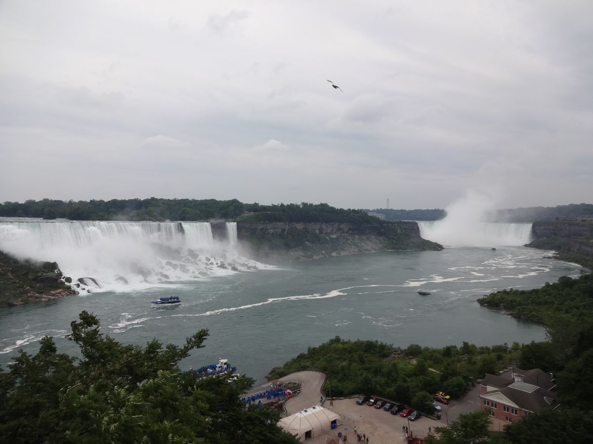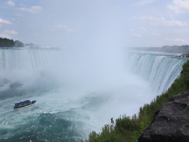 念願叶い、ついに行ってきました!早朝、5時40分ヒルトンホテル集合でJFK空港まで連れて行ってもらい、空港で別のガイドさんから搭乗券を受け取り飛行機を待ちました。予定どおりに飛行機は出発し、バッファロー空港に到着。出口でガイドさんが笑顔で迎えてくれ、バンに乗り込み一路ナイアガラへ。30分程度で国境の橋に到着し車窓から滝が見え大興奮。バンをいったん降りカナダの入国手続きを済ませついに到着。そのままMaid of the Mistボート乗り場へ。夏休みで列は長く少し待ちましたが、滝を眺め、写真をとりながらなので、待っている間も楽しめました。ボートに乗り込み、1階、2階、どっちに乗るか迷ったのですが、ずぶ濡れを避けるため、あえて、1階後方に乗りました。滝に大接近したときは1階でも横殴りの雨のように水しぶきがとんできて大変でしたが、目の前で轟音を立てる巨大滝は大迫力でした。下船しシェラトンホテルに移動、高層階の滝が見えるレストランでランチ。朝から何も食べていなかったので、食べ放題はありがたかったです。食事の後、テーブルロック(滝の真横のポイント)へ移動。半円状の巨大な滝から水が落下していく様は圧巻でした。お土産屋さんに行った後、3時間の自由時間をもらえたので、テーブルロックに戻り、滝を下から見るアトラクション(Journey Behind the Falls)にチケットを買って参加しました。待ち時間が長ければ諦めるつもりでしたが、運良く20分程で入場することができ、下から見上げる滝を楽しむことができました。いつまでもそこにいたかったのですが、集合時間に余裕をもって戻りたかったので、いつかまた来るぞと心に誓い滝に別れを告げました。帰りの飛行機の出発は遅れましたが、体験談でも遅れると書いてあったのでのんびり待ちました。格安航空会社のジェットブルーなので仕方ないですね。JFK空港に着いたときはくたくたで、お迎えのドライバーさんにバンに乗せてもらい、うとうとしている間にマンハッタンのホテルに到着。時刻は11時半を過ぎていました。朝5時に出発したのでたっぷり2日分遊んだ気分でした。とても疲れましたが、たった1日でマンハッタンからナイアガラ滝にこうやっていけるなんて本当に感謝です。ドライバーさん、ガイドさん、このツアーに関わるみなさん本当にありがとうございました!