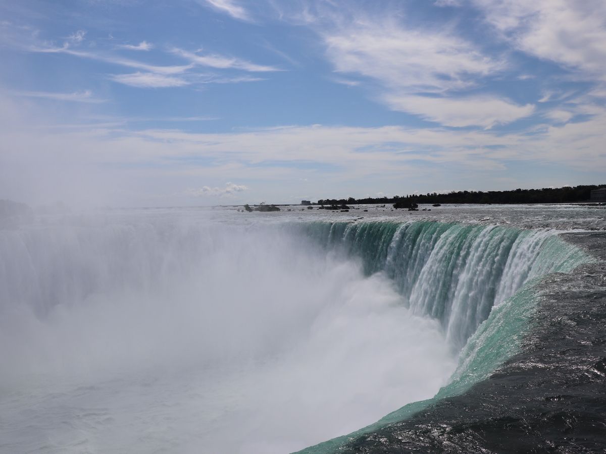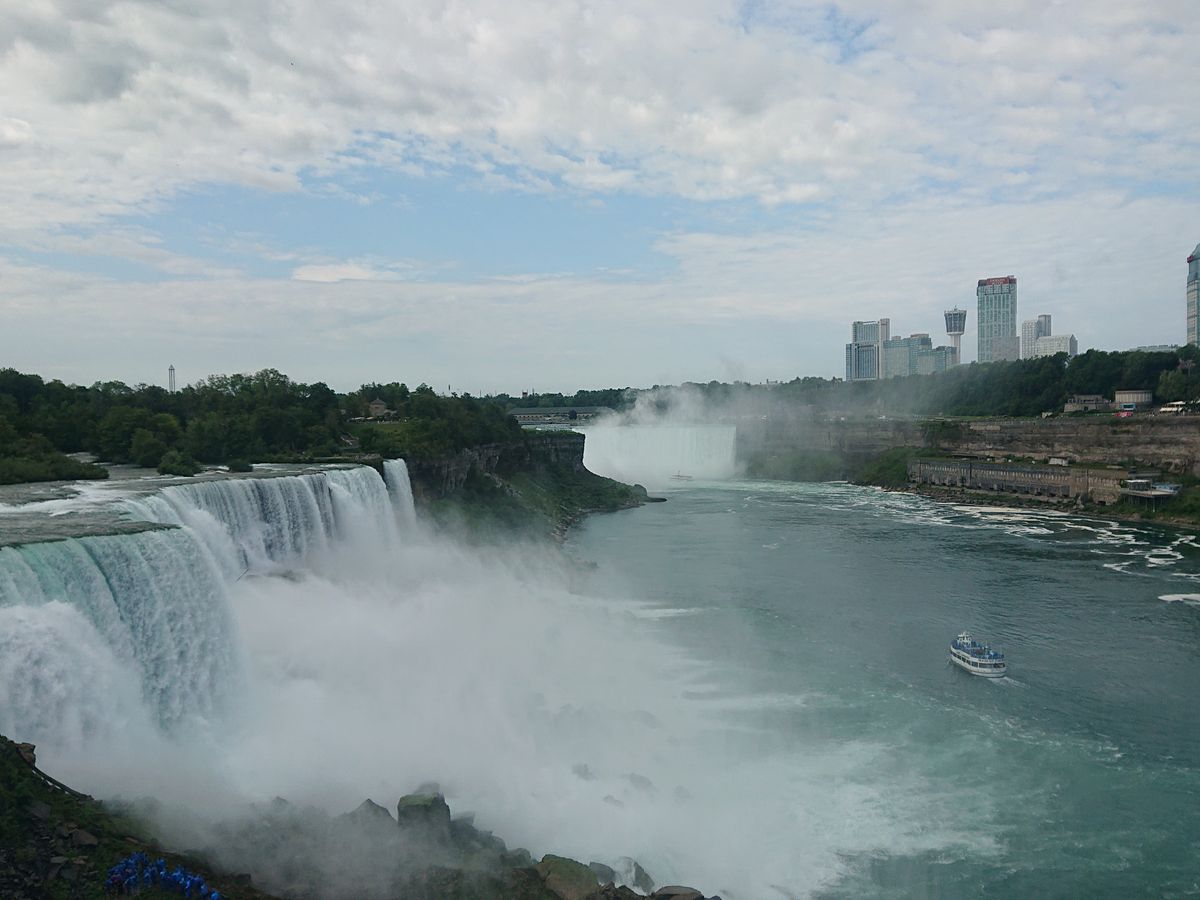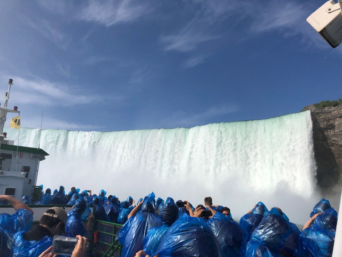 ・アメリカ滝 遊覧船「霧の乙女号」滝の下へ......船で滝の下から滝を仰ぎ見ると、上から見る景観とは全く異なり、大迫力のアメリカ滝とカナダ滝を見ることが出来ます。カナダ滝は物凄い水量の滝を浴びますが、ポンチョを貰えるので、顔と手のみ濡れるだけです。足元もビショビショになりますので、裸足で履けるサンダルは必携です。