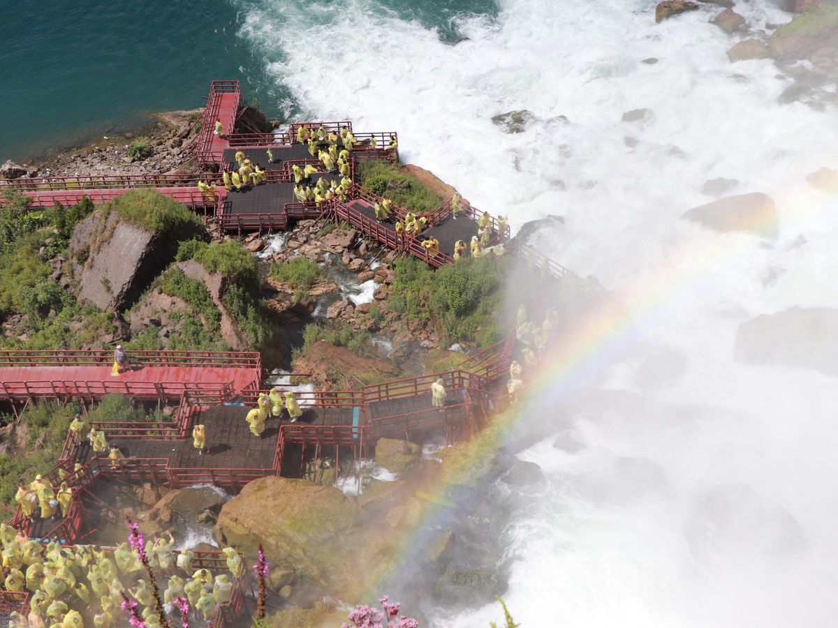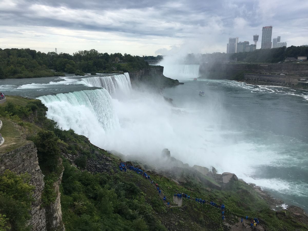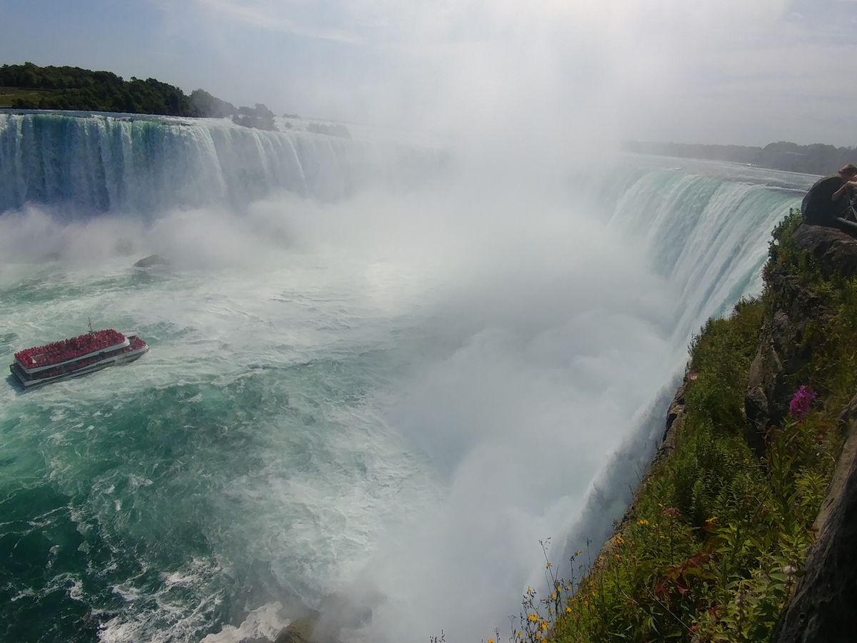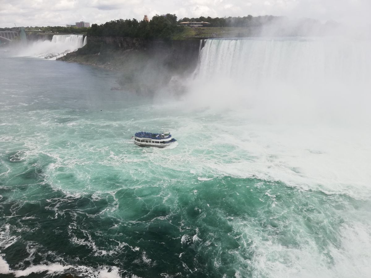 ・アメリカ滝 遊覧船「霧の乙女号」滝の下へ......船で滝の下から滝を仰ぎ見ると、上から見る景観とは全く異なり、大迫力のアメリカ滝とカナダ滝を見ることが出来ます。カナダ滝は物凄い水量の滝を浴びますが、ポンチョを貰えるので、顔と手のみ濡れるだけです。足元もビショビショになりますので、裸足で履けるサンダルは必携です。