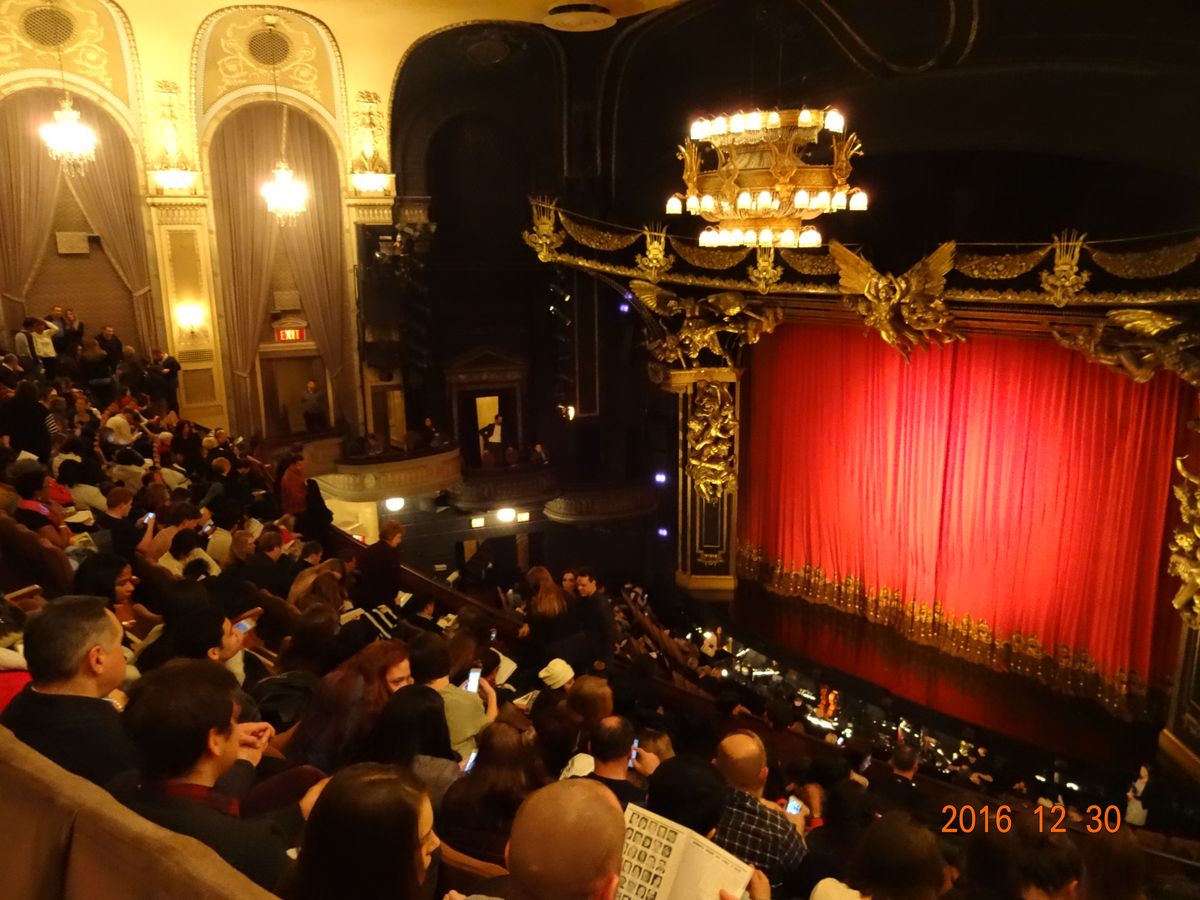 直前までバルコニー席か1階かで迷いましたが、バルコニー席で正解でした。劇場はマンハッタンで一番由緒ある劇場だそうで、内部は素敵な装飾で始まる前からおとぎの国に入り込んだようでした。入口でチケットを受け取るところから、エレベーターのボーイさんまでみなさんプロフェッショナルで、長年のミュージカルの歴史というものを感じました。アラジンは映画で見ましたが、実際のミュージカルで見るのはまた格別です。耳慣れた曲も多く主人ともども楽しみました。
