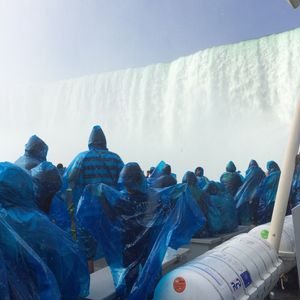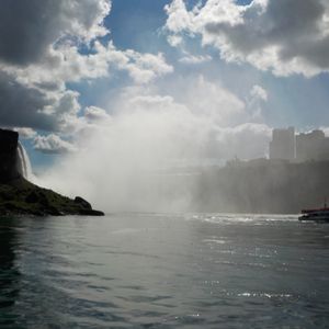 アメリカ側から船で滝の近くへ <- 本当に濡れます