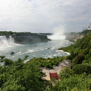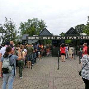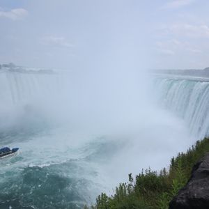 念願叶い、ついに行ってきました!早朝、5時40分ヒルトンホテル集合でJFK空港まで連れて行ってもらい、空港で別のガイドさんから搭乗券を受け取り飛行機を待ちました。予定どおりに飛行機は出発し、バッファロー空港に到着。出口でガイドさんが笑顔で迎えてくれ、バンに乗り込み一路ナイアガラへ。30分程度で国境の橋に到着し車窓から滝が見え大興奮。バンをいったん降りカナダの入国手続きを済ませついに到着。そのままMaid of the Mistボート乗り場へ。夏休みで列は長く少し待ちましたが、滝を眺め、写真をとりながらなので、待っている間も楽しめました。ボートに乗り込み、1階、2階、どっちに乗るか迷ったのですが、ずぶ濡れを避けるため、あえて、1階後方に乗りました。滝に大接近したときは1階でも横殴りの雨のように水しぶきがとんできて大変でしたが、目の前で轟音を立てる巨大滝は大迫力でした。下船しシェラトンホテルに移動、高層階の滝が見えるレストランでランチ。朝から何も食べていなかったので、食べ放題はありがたかったです。食事の後、テーブルロック(滝の真横のポイント)へ移動。半円状の巨大な滝から水が落下していく様は圧巻でした。お土産屋さんに行った後、3時間の自由時間をもらえたので、テーブルロックに戻り、滝を下から見るアトラクション(Journey Behind the Falls)にチケットを買って参加しました。待ち時間が長ければ諦めるつもりでしたが、運良く20分程で入場することができ、下から見上げる滝を楽しむことができました。いつまでもそこにいたかったのですが、集合時間に余裕をもって戻りたかったので、いつかまた来るぞと心に誓い滝に別れを告げました。帰りの飛行機の出発は遅れましたが、体験談でも遅れると書いてあったのでのんびり待ちました。格安航空会社のジェットブルーなので仕方ないですね。JFK空港に着いたときはくたくたで、お迎えのドライバーさんにバンに乗せてもらい、うとうとしている間にマンハッタンのホテルに到着。時刻は11時半を過ぎていました。朝5時に出発したのでたっぷり2日分遊んだ気分でした。とても疲れましたが、たった1日でマンハッタンからナイアガラ滝にこうやっていけるなんて本当に感謝です。ドライバーさん、ガイドさん、このツアーに関わるみなさん本当にありがとうございました!