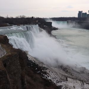 まずは、空港からナイアガラまでバッファローの町案内で伝統的な街を見ることになりました。小さい街なのですが建物とか歴史的なものも多く見ていて飽きることはありませんでした。しばらく走ったところで大きな湖があり、そこでちょっと休憩と記念撮影。雪が残るその場所で休憩とか言いながら寒さに負けてガイドさん。サー行こう(笑)。しばらく走るとナイアガラ川に着き、この辺は公園が多いとのことこの公園は、人も(地元の人)多く、ナイアガラ川もまじかに見れてその大きさに驚きました。トイレなどを済ませて次の公園に少しづつ滝に近づく感じでした。滝から下流にワールプールという場所があり、滝から流れた川がここでいったん回って出ていく場所で有名な場所とのことです。その先にデビルズホールという場所があり、正直何処がホール?となりましたが古びた木の階段が永遠続き岸まで降りれるようですが通行止めになっていました。多分この辺は、通常のツアーではない場所と思います。