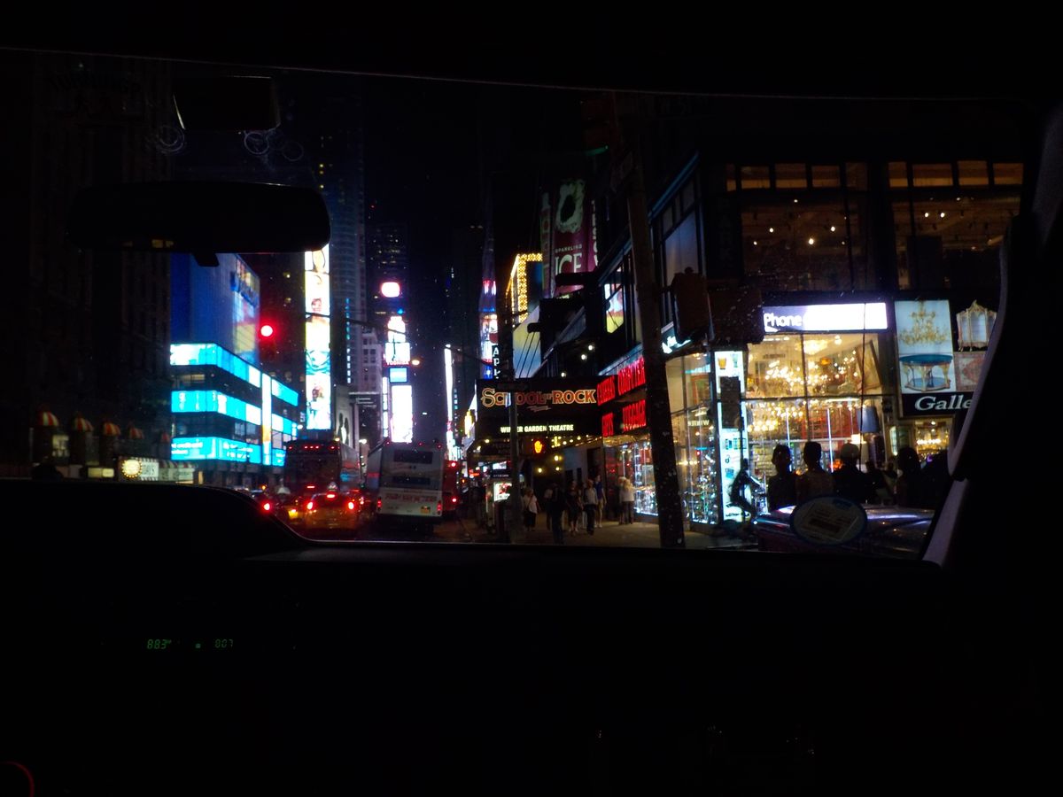 ニューヨーク昼入りであれば、このツアーの前にトップ・オブ・ザ・ロックにのぼり、大体の位置関係や町並みを理解しておくと夜のこのツアーがより一層楽しめる。0時を過ぎるが宿泊先まで送ってくれるので安心。集合場所もタイムズスクエアなので時間調整が楽しい(画像はバン乗車時タイムズスクエア方面を)。