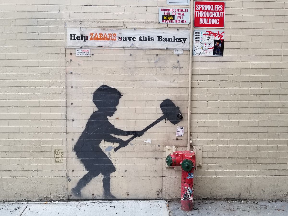 そしてチェルシーマーケットで昼食。N原さんおすすめのマンハッタンクラムチャウダーとロブスターロールサンドを食べましたが、大変美味しかったです。食後はニューヨークで一番クールといわれるスタバの店舗「スターバックス・リザーブ・ロースタリー ニューヨーク店」に行きました。広々とした店内はカフェカウンターのデザインがかっこよく、コーヒ-豆の焙煎所もあり高級感漂うお店でした。見学だけの予定でしたが思わずニューヨーク限定のお土産を購入していました。その後はコロンバスサークルからダコタハウス、セントラルパークへ。途中、少し離れいていて行きにくいからということで、見たかった「バンクシー Hammer Boy」の場所まで回っていただき写真を撮ることもできました。そしてメトロポリタン美術館の前から五番街を南下「ホームアローン2」のプラザホテルの前を通り、ティファニー、トランプタワーの前を通り最終目的地のロックフェラーセンターへ。トップオブザロック入場券をもらってお別れとなりました。
