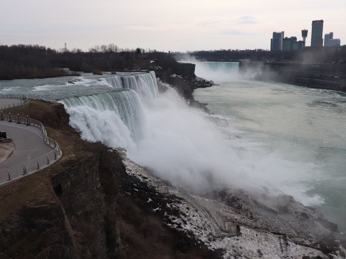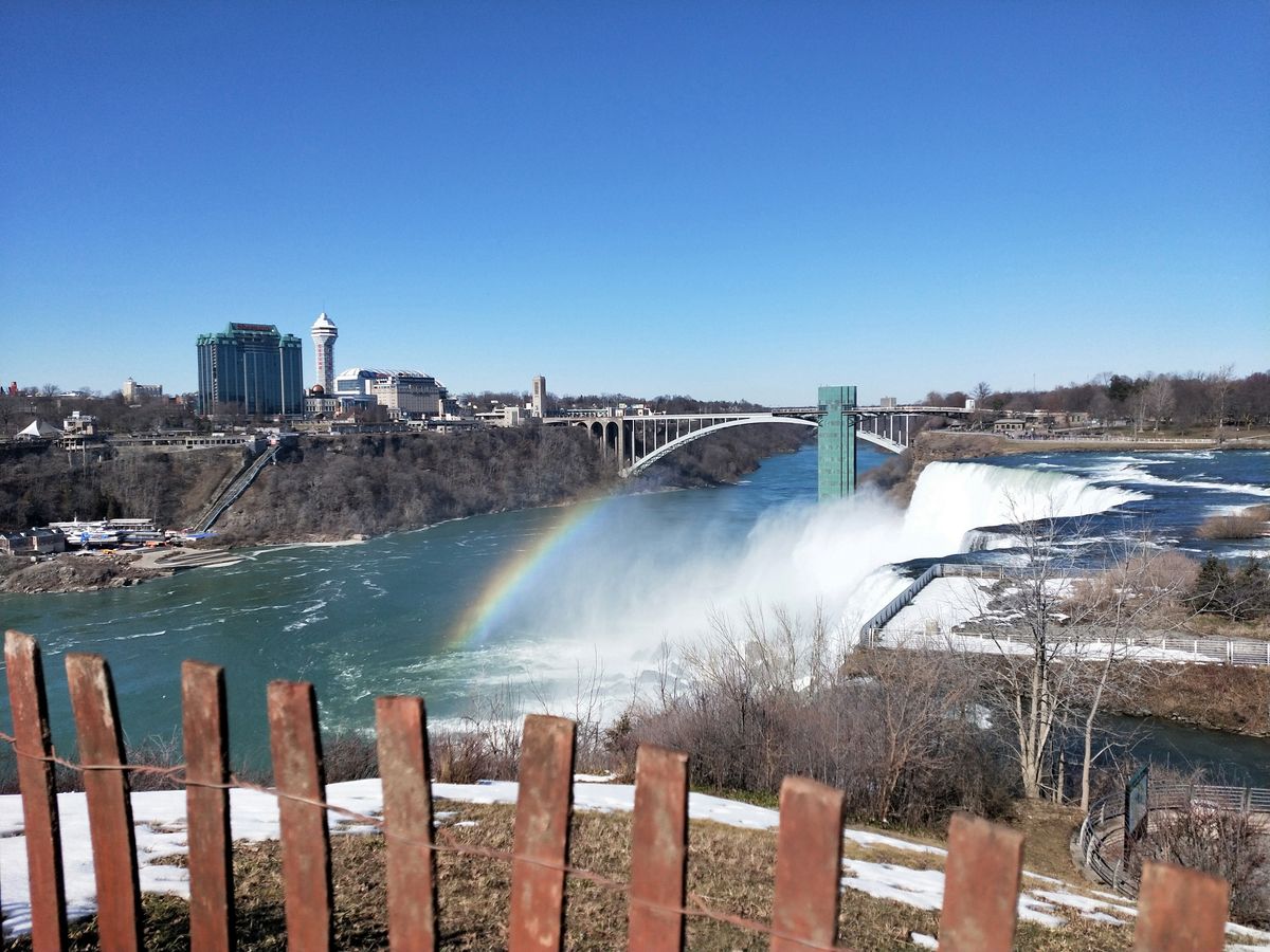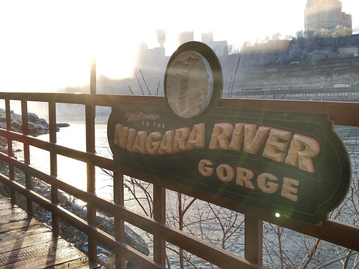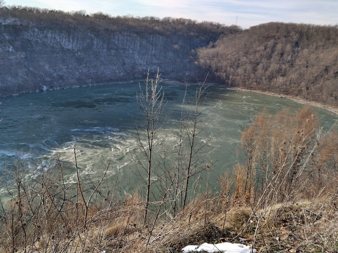まずは、空港からナイアガラまでバッファローの町案内で伝統的な街を見ることになりました。小さい街なのですが建物とか歴史的なものも多く見ていて飽きることはありませんでした。しばらく走ったところで大きな湖があり、そこでちょっと休憩と記念撮影。雪が残るその場所で休憩とか言いながら寒さに負けてガイドさん。サー行こう(笑)。しばらく走るとナイアガラ川に着き、この辺は公園が多いとのことこの公園は、人も(地元の人)多く、ナイアガラ川もまじかに見れてその大きさに驚きました。トイレなどを済ませて次の公園に少しづつ滝に近づく感じでした。滝から下流にワールプールという場所があり、滝から流れた川がここでいったん回って出ていく場所で有名な場所とのことです。その先にデビルズホールという場所があり、正直何処がホール?となりましたが古びた木の階段が永遠続き岸まで降りれるようですが通行止めになっていました。多分この辺は、通常のツアーではない場所と思います。