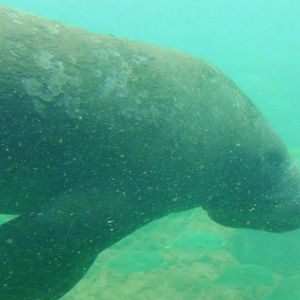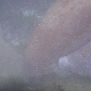 寒い頃がシーズンだと聞いていたので、会えないかもと、心配していましたが、会えました。意外に、岸から、すぐのところに、いました。水の透明度は低いのですが、ガイドの方に、この辺を見てろと言われて、待っていると、自分が浮いているところの真下に、マナティが、ぬうっと現れて、マナティの上に、自分がのかってしまうのではないかと心配になる感じでした。触ってみると、温かくて、ぬるっと、してました。背中を触ったくらいでは、なんとも思わないようです。透明度のせいで、すうっと、動いていって、いなくなる感じです。夏休みでも、きっと、会えると思います。写真は、ホモサッサ公園の水中展望台から撮ったマナティです。だいたい、こんな感じですが、一緒に泳ぐところは、こんなに透明度は高くなく、水深は、ずっと、浅いです。魚は、見えません。一緒に、泳ぐところは、水深1メートルも、ないと思います。ただ、ボートで行くので、ボートを留めるところは、足は、つかない深さです。