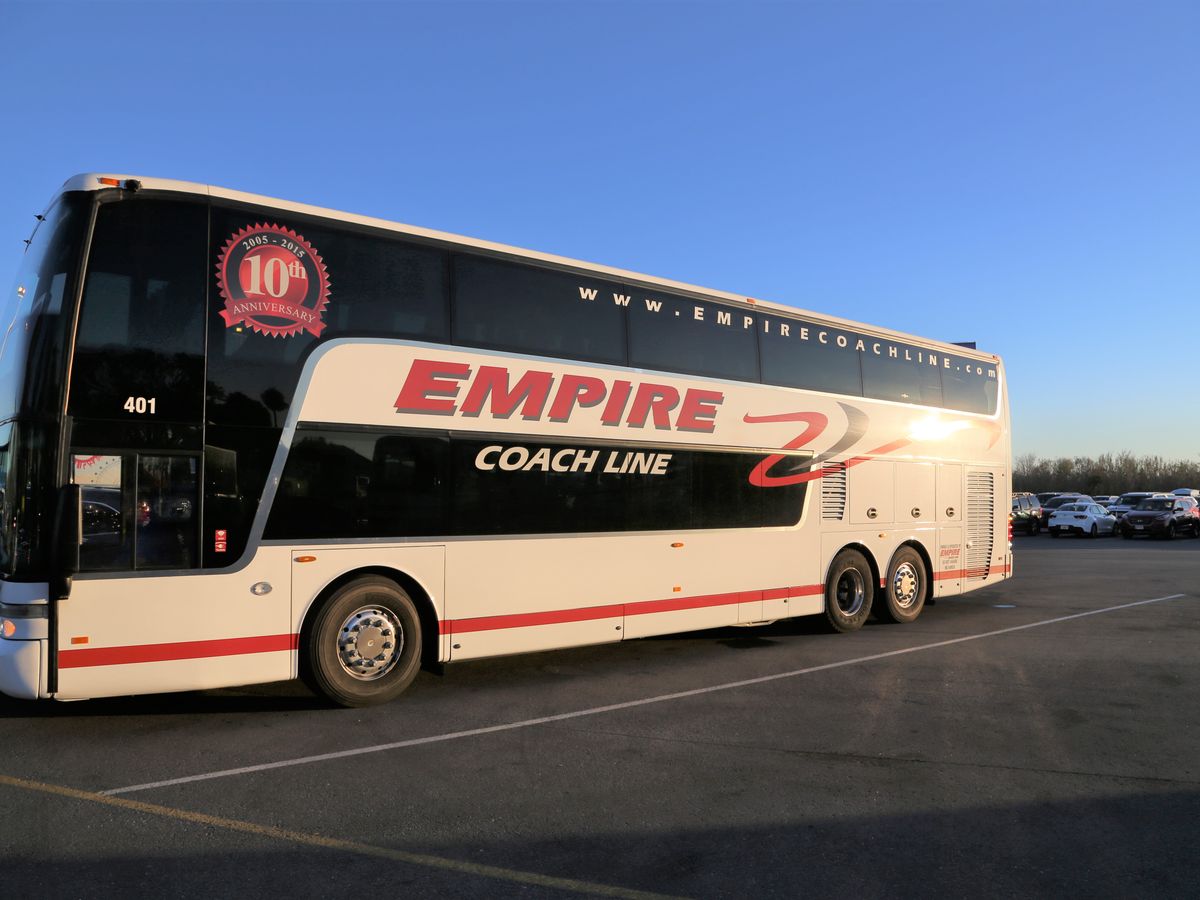 55にピックアップ予定に対して、2~3分遅れ。バスは2階建てでWifiやお手洗いも整備しているので、長時間でも安心。