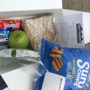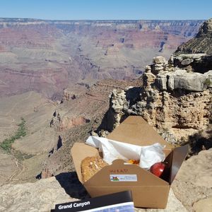 ランチは、バスに乗った際に2,3種類の中から予め選ぶよう用紙が渡されます。グランドキャニオンに着いたときにランチボックスが渡され、私はターキーサンドを選択。中にはスナックやリンゴなども入っていてボリューム満点。野菜などは別に包装されていて自分でサンドして絶景を見ながら食べました。