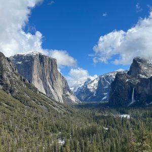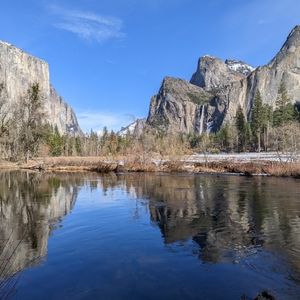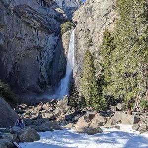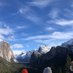 天気予報は雨、ただでさえ記録的な大嵐が来ている最中のはずでしたが、トンネルビューに着いた瞬間最高の天気に!雪が降ったからこそ山並みの形が良く見えて、それだけでも行く価値ありでした。15分しか停車しなかったので本当にもったいなかったです!やはり冬季のためセコイアへは行かず、ヨセミテバレーで3時間の自由時間でした。(それならトンネルビューをあと10分長くしてくれても…!)