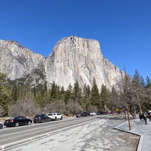 トレイルにはガイドさんがくれる地図の範囲内で行って帰ってきてよ、無理するなよ、という雰囲気でした。ヨセミテ滝は駐車場から程近く、ロッジの食堂も利用できて便利でした。地図で紹介されたのはほとんど平坦な道で、舗装路もあって雪でぐちゃぐちゃしてなければ歩きやすいのですが、標識や看板が少なく、自分が今どこにいるのか非常にわかりにくいので注意です。帰る前、最後にエルキャピタンでも少し止まって写真を撮る時間がありました。