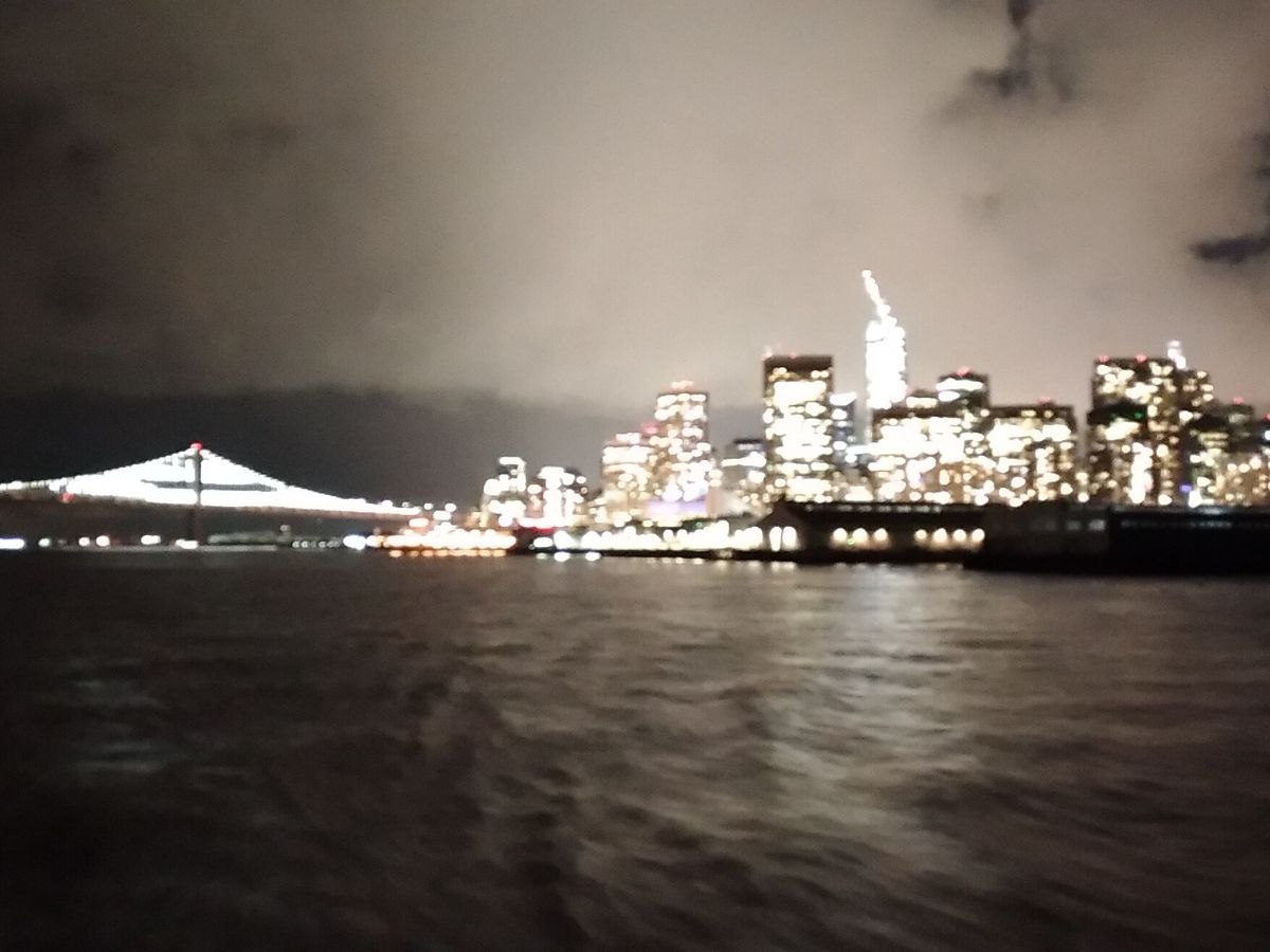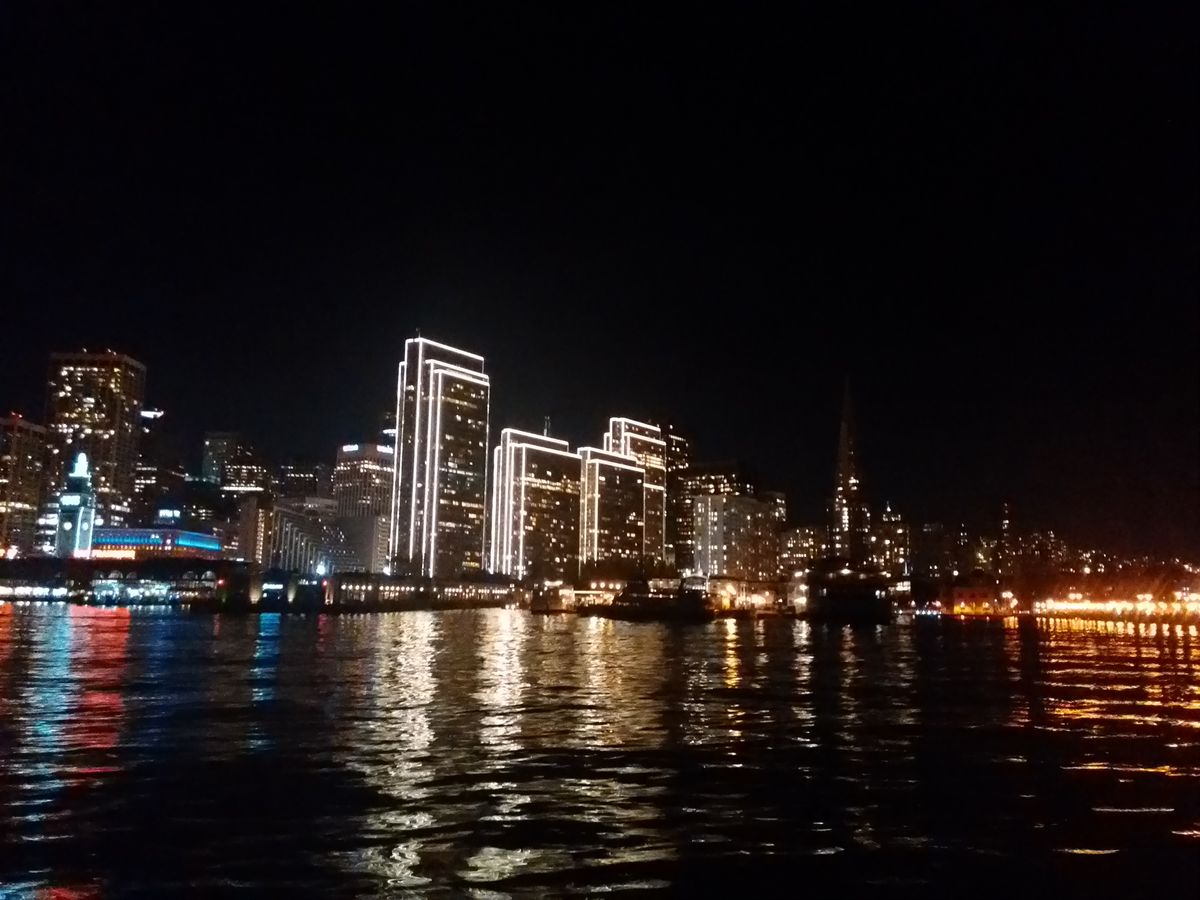 12月のサンフランシスコは東京より少し暖かい。クルーズ船で海に出てもコートを着てれば大丈夫です。ロサンゼルスとサンフランシスコ旅行の最終日でしたが、橋はライトアップされ、旅の締めくくりには絶好のツアーでした。季節によっては、夕暮れのサンフランシスコを海から眺めることもできるでしょうね。