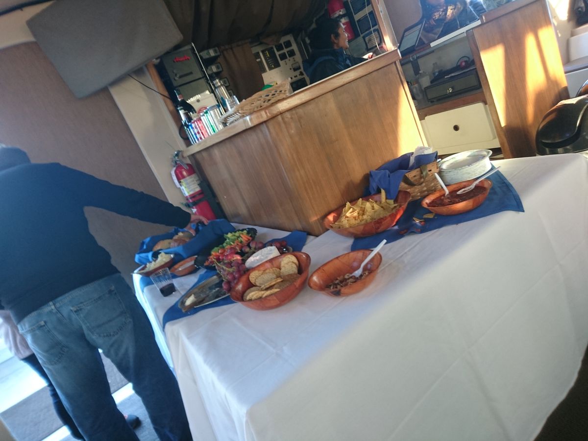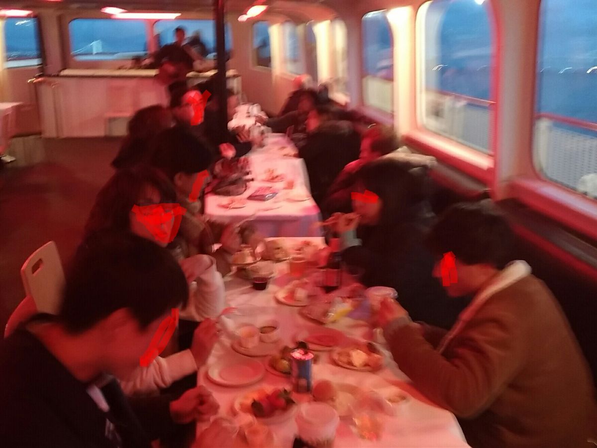 家族5人と友人1人で、サンセットクルーズ(軽食付)に参加。2月のサンフランシスコの夕方ということで、防寒着を着ても外は寒かったので、ほとんど室内で食事をしながら景色を楽しみました。