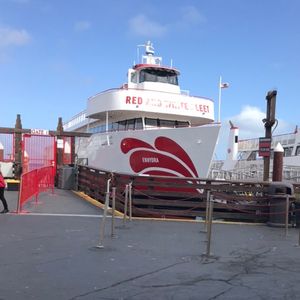 ジェファーソン&テイラー通りでFラインを降り海に向かって歩くと看板と船が見えて来ました。直ぐ分かります。バウチャーを見せて1時からの予約をしました。朝は霧があるので昼からが良いです。近くのスーパーマーケットとか買い物を済ませ出港少し前に列に並びました。三階からの眺めは良いですが寒くて風が強かったです。日本語のオーディオガイドの説明も良かったです。殆ど英語を話せ無い私は達でも迷う事なく楽しめました。