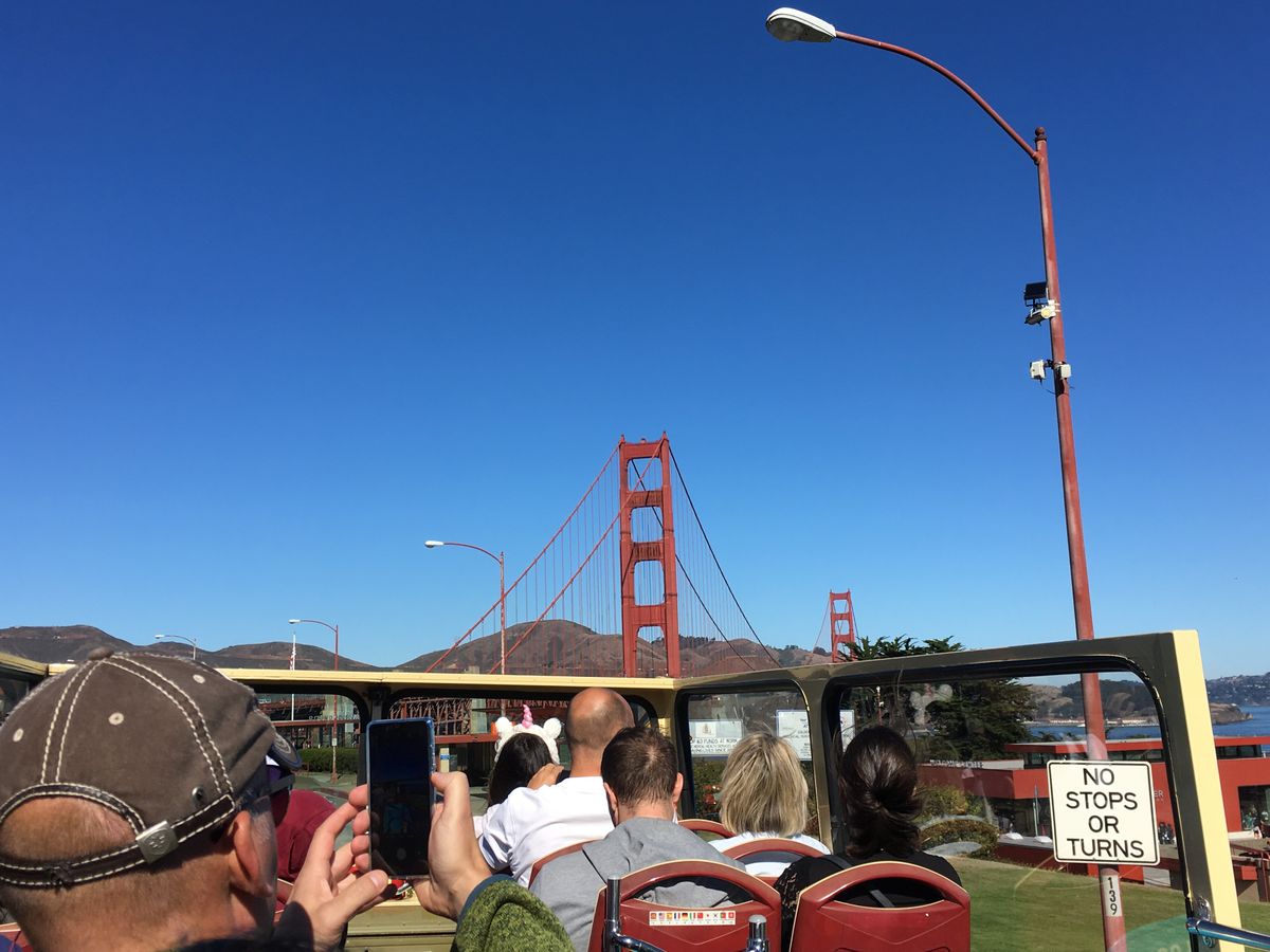 サンフランシスコにくるといつもこのバスに乗ります。今回は叔母との旅行で、叔母は初サンフランシスコ、初アメリカだったので、あちこち巡るにはとても便利なバスでした。乗り降り自由で、乗った時にイヤホンをもらえるのですが、日本語の音声案内を聞くことができます。ゴールデンゲートブリッジで乗り換えてサウサリートにも行くことができます。ゴールデンゲートブリッジでは降車する方が多く、ビューポイントで写真を撮ってる方が多くいらっしゃいました。フィッシャーマンズワーフから市内をグルッと一周、ゴールデンゲートブリッジで少し降りて、サウサリートには行かない市内一周コースで、今回は3時間くらいかかりました。お天気も良く気持ちよかったです。風がきついので、寒さ対策はされたほうがいいかもしれないです。また次回も利用したいです。