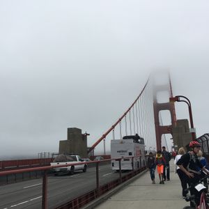登り坂でヘロヘロになりながらも、平たんな道、下り坂では周りの景色を眺める余裕も出て、サンフランシスコの街並み、海と空の青さに映える白いヨットやクルーズ船の美しいコントラスト、そして、朝早い時間は綺麗に見えていた赤いゴールデンゲートブリッジが次第に霧に覆われていき、完全に霧で見えなくなり、そして、霧が次第に晴れて、再びゴールデンゲートブリッジがその美しい姿を現すさまを眺めることができました。無事にブリッジを走り終えて、ガイドさんからいただいたチョコレートの美味しかったこと!