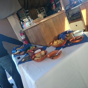 私はひとりで参加しましたが、まわりはカップルがいっぱい。カップルでなくてもグループ参加が多かったようです。たまたま1人でいる黒人女性を見つけたので話しかけてみたら気さくでとってもいい感じの人だったので、ずっと一緒に過ごしました。こんなのも旅の醍醐味ですよね。それにしても、外の寒さは手がかじかむほど。しばらくデッキで写真撮影に興じたあとは船内で軽食を食べていました。軽食は野菜スティック、チーズ、バゲット、ディップ、フルーツ、ナッツ、という感じです。バゲットもあったのでそこそこお腹にたまりました。2杯のドリンクがついていましたが、寒かったので1杯で十分でした。
