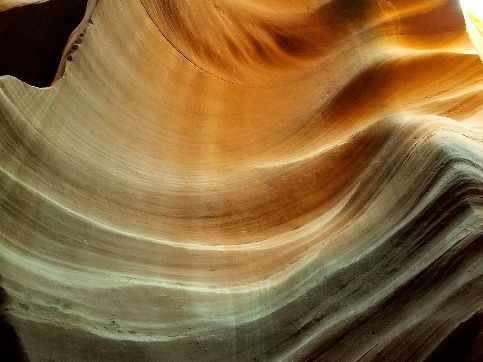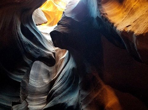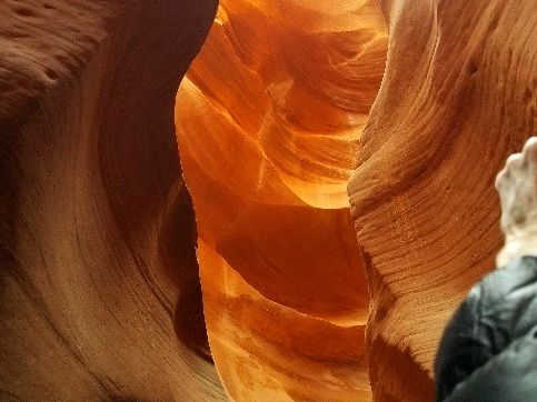 昼前頃にローワーアンテロープキャニオンに到着。10人程度のグループに1名のナバホ族の方がガイドとしてついてくれ、案内してくれます。私たちのグループは、若い男性のガイドさんがついてくれましたが、説明(英語です)がとても上手でわかりやすく、また、アンテロープキャニオンができた経緯を実演で説明してくれました。ナバホ族のガイドさんたちは、写真を撮るのが非常に上手で、要所要所で各人のスマホやカメラで写真を撮ってくれるのですが、どれも自分のスマホで撮ったとは思えないほど素晴らしい写真が撮れました。