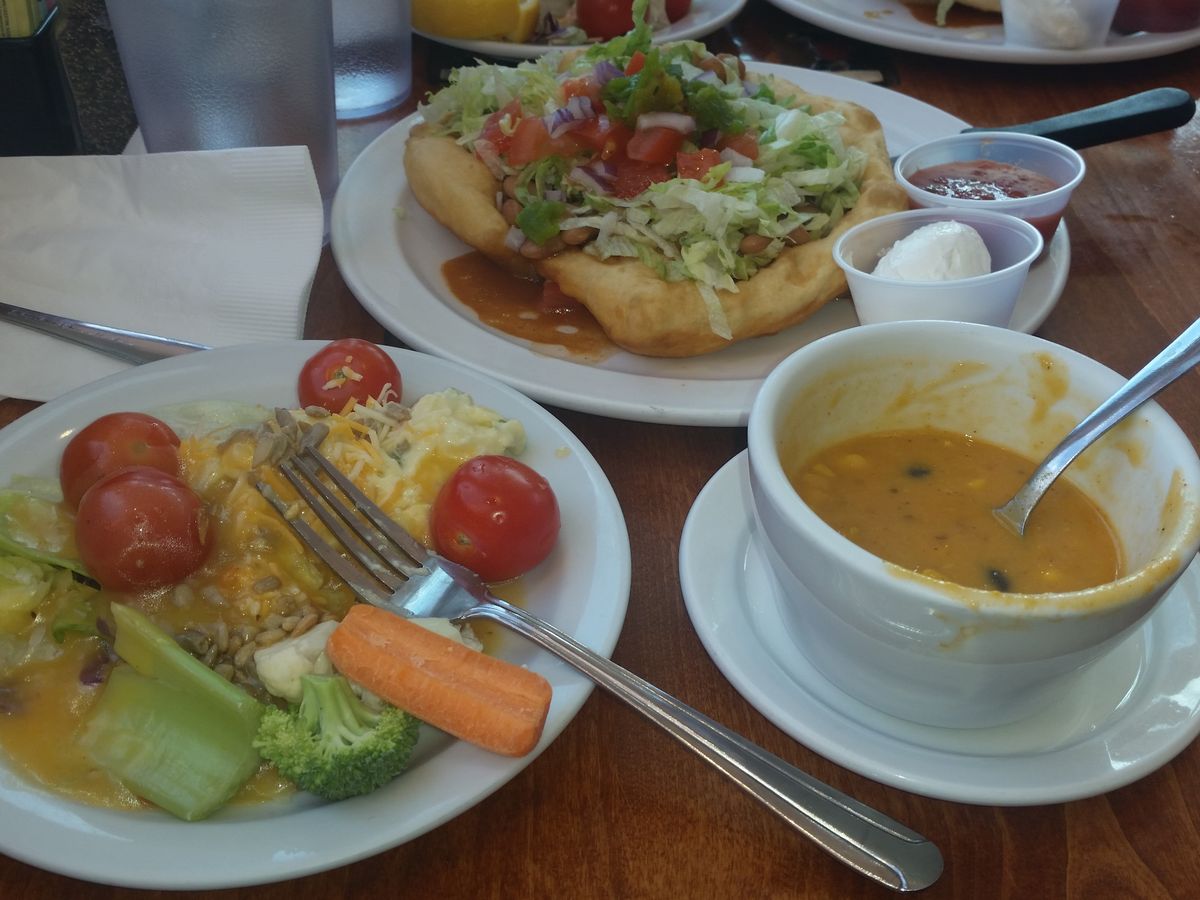 心配していた天気もたくさんのショットを撮ってもらっているうちに、晴れてきたところでランチタイム。展望台のレストランでナバホ名物のタコス。セルフのサラダビュッフェとスープ付。野菜たっぷりでとてもおいしかったです。