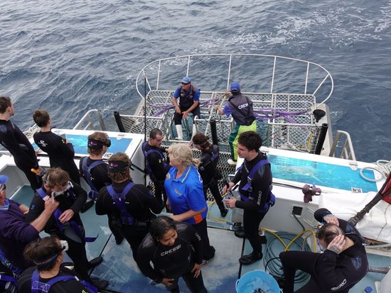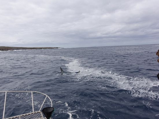 30分ほどサメの出現を待ちましたが背ビレは現れず。それでもチームを分けて水中で待つことに。。。晩夏ではあったものの水温は18度。7ミリのレンタルウェットスーツでは30分間が限度。何も見えずに震えながらボートへ上がりトイレに駆け込んで温かいシャワーで体を解凍していると外が大騒ぎに!