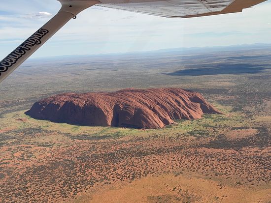 先住民の聖地、ウルルを上空から眺望。「地球のへそ」ともいわれる巨大な一枚岩は迫力満点。地上からではご覧いただけない角度から見渡すことができます。