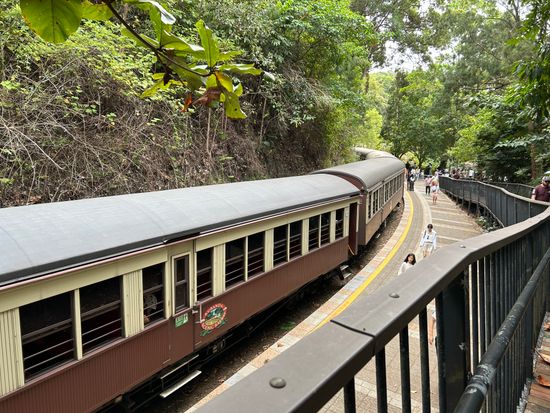 二度目のキュランンダです。 一度目は車で登ったので、スカイレールとキュランダ鉄道は初めてでした。 スカイレールでは事前に入れたアプリから、日本語で伝説などの解説が聞けました。 登って行くたびに違う解説が続きます。 上空から野生のカンガルーも見れました。 復路はキュランダ鉄道。歴史を感じる、テレビでも観ていた列車で感動します。ケアンズの町に戻ってくると、汽笛の音を聞いて、町の方達が手を振りに、家