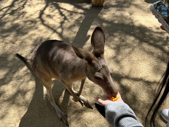 飼育員がその日の食事具合を見て餌をお渡しいたします。人の背よりも大きなカンガルーから小さなワラビーまで、たくさんのカンガルー&ワラビーと触れ合えます。
