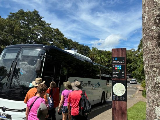 キュランダ村にあるバタフライ・サンクチュアリー前から、レインフォレステーションまでのシャトルバスが運行しています。ご希望の方は、ご予約の際に追加オプション「シャトルバス往復送迎」をご選択ください。
