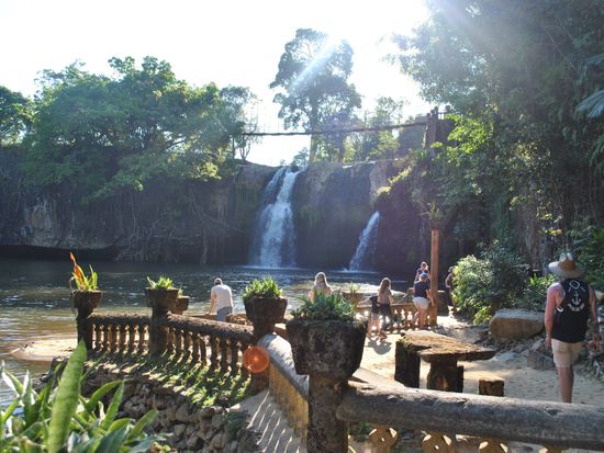 まずは、ジョゼフィン滝に到着。水の色が青緑と綺麗で、水着があれば川で泳ぐごとができます。そのあとは広大なさとうきび畑やバナナ畑を通ってスカイウォークへ。