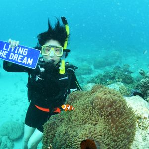 そしていよいよ器具を付けて体験ダイブの始まり。腰に付けた重りやタンクが思っていた以上に重かったです。キムくんというインストラクターさんに3人ついて、船の横にあるロープでつるされたバーにつかまり、マスクに入った水のぬき方やレギュレーターが外れてしまった時の対処の仕方など、出来るようになるまで繰り返し練習しました。この時口に水が入り不安感が高まってしまい、(やっぱりやめようか…)と頭をかすめましたが、キム君に言うと、「大丈夫、ちゃんとできているから。」と励まされ、ロープ伝いに少しずつ深いところへ移動。キム君の腕にしっかりとつかまって泳ぎはじめました。こうして1回目の体験ダイブは緊張している間に終了。海の美しさを楽しむというより、自分の呼吸を確保することでいっぱいいっぱいだったと言うのが感想。一人一人、カクレクマノミと一緒に記念写真を撮っていただきましたが、やっぱり顔が引きつってた…(汗)