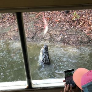 ボートでワニの池に行って、実際に餌を狙いに来るどう猛さも体験出来ます。