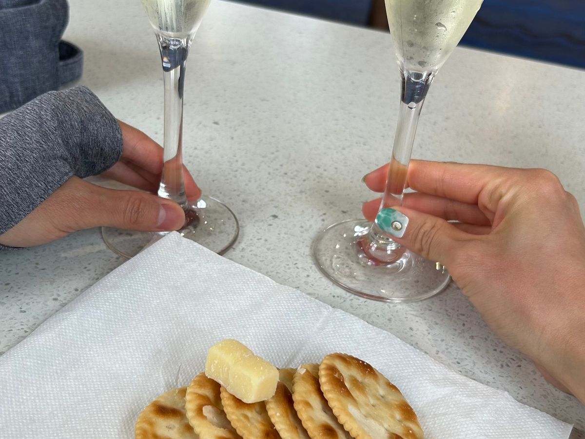 船が出発して少しすると、チーズとクラッカーとスパークリングワインをいただけました。