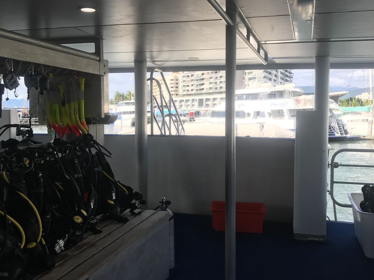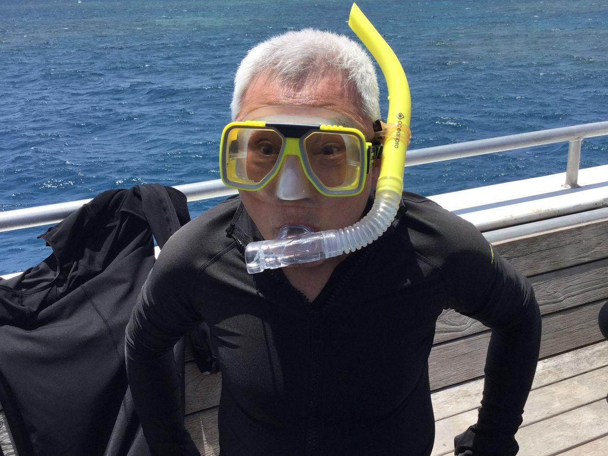 ケアンズ2日目の「シュノーケリングと体験ダイビング」。ケアンズから約50キロ沖のポイント、ダグラスシャイア(?)辺りに1.5時間かけて到着。その間ダイビングの丁寧なガイダンスを聞きます。到着後、アクアラングをつけて海に潜ります。途中から、口呼吸が下手で口に海水が入ってきてしまいました。それでも安全に、シュノーケリングに変更できました。67歳にして初ダイビングです、許して! シュノーケリングではしばらくすると口呼吸も上手くなり、カラフルな魚がウンチするシーンも見れました。うちの奥さんは「時々海女さん」の娘でもあり、ダイビングを楽しんだみたいです。くやしい‼️ けど、楽しかったです。夕方4時くらいに帰港。スタッフのたくさん居て、安全面でもかなり気を使っています。