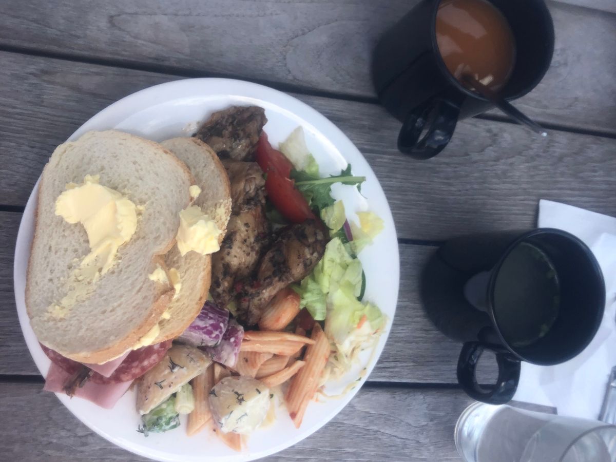 お昼ご飯と飲み物の種類、フルーツは少し物足りなかったです。