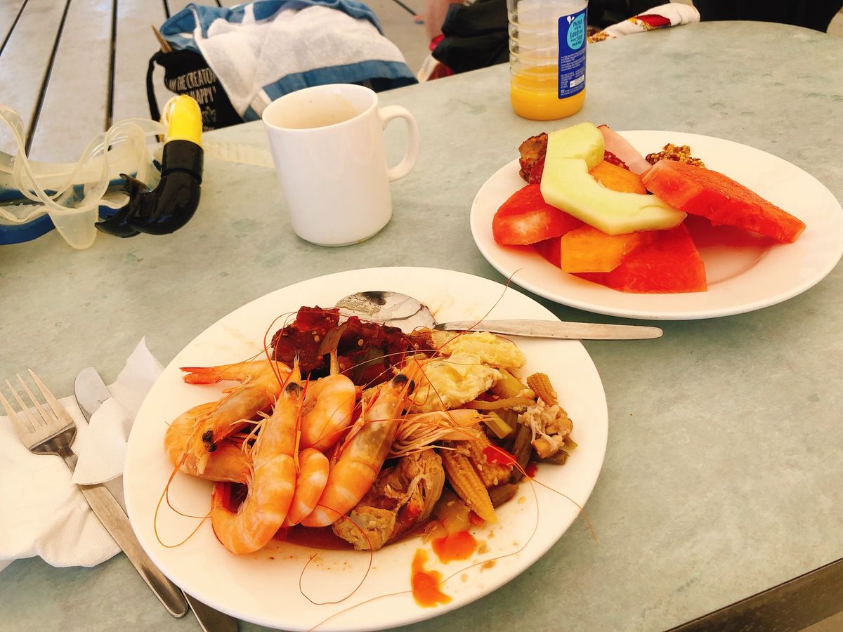 昼食ではパン、エビ、チキン、フルーツなどなどブッフェ形式で満足できました。